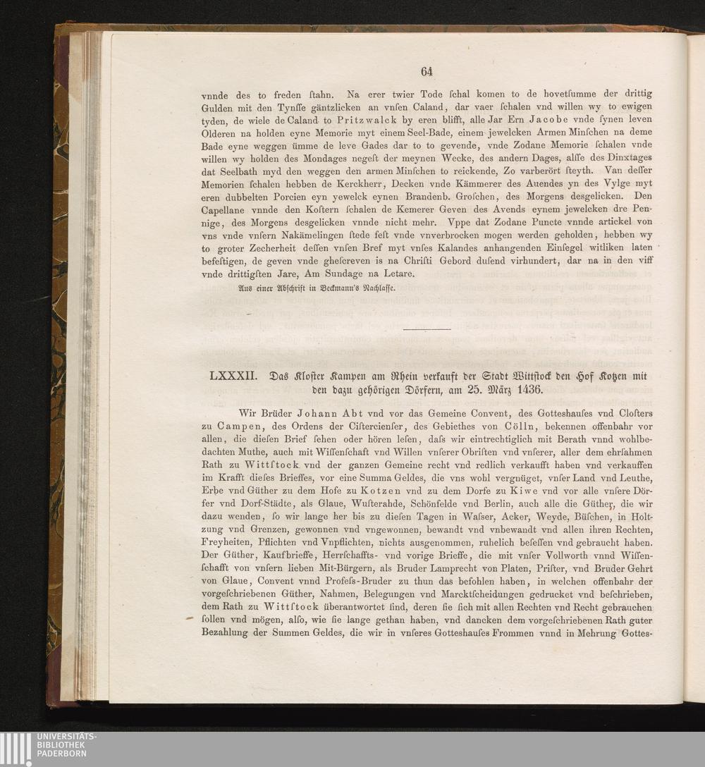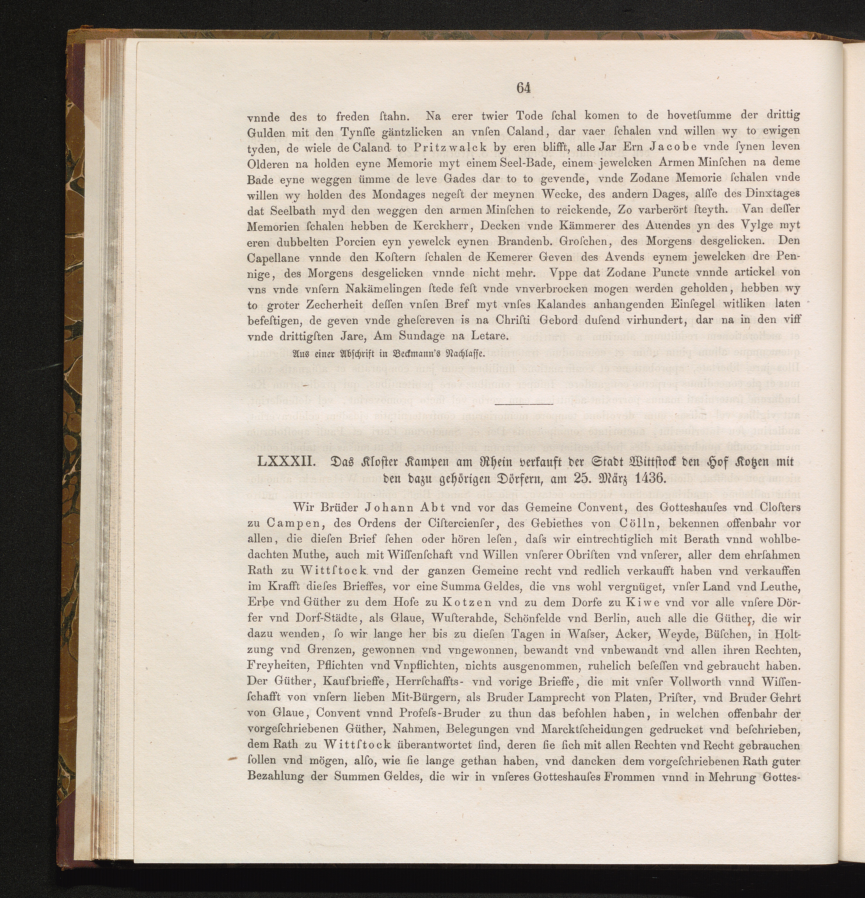 LXXXII. Das Kloster Kampen am Rhein verkauft der Stadt Wittstock den Hof Kotzen mit[...]