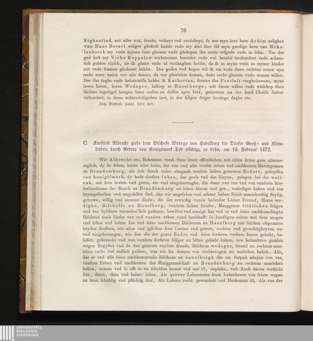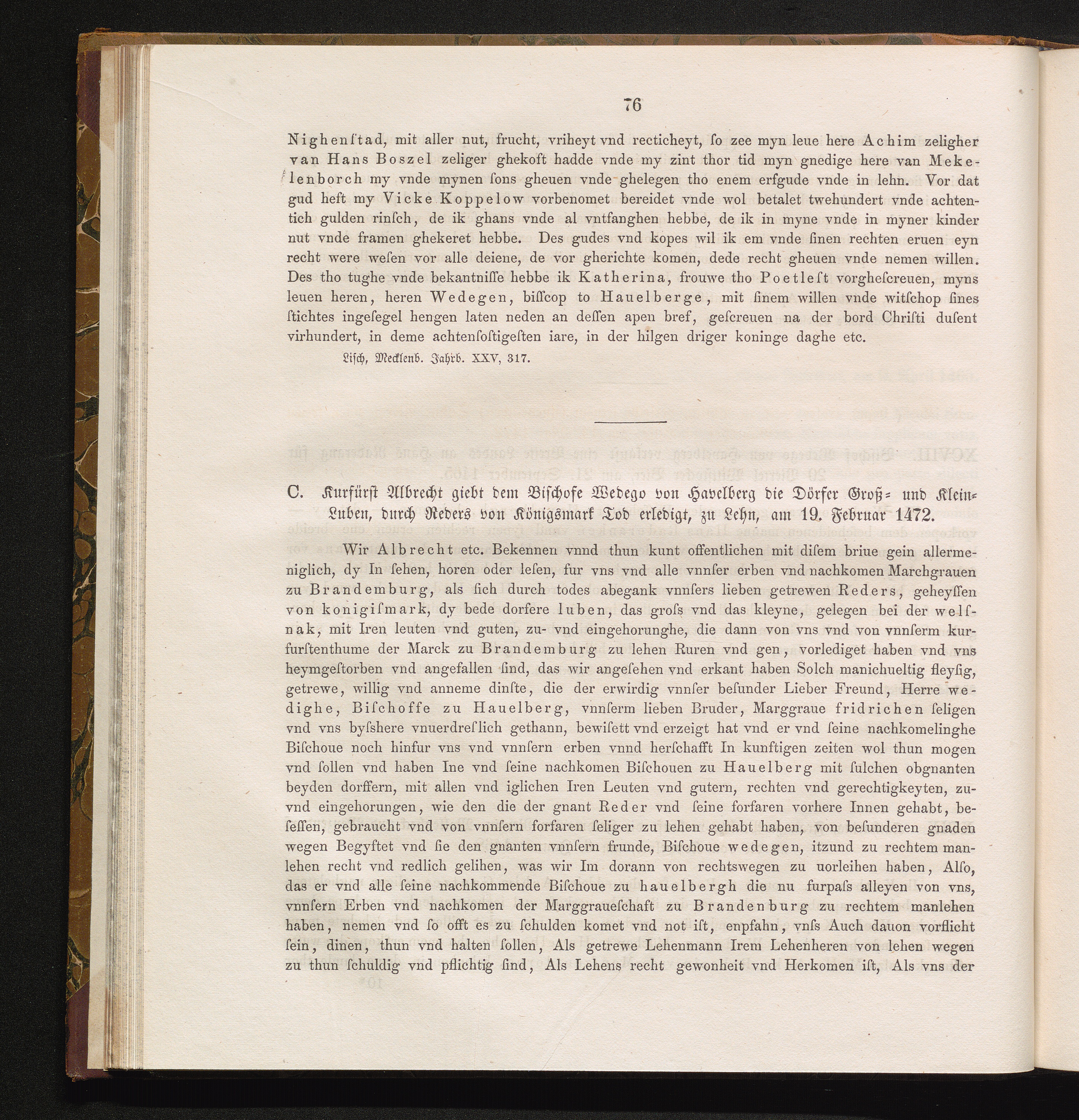 C. Kurfürst Albrecht giebt dem Bischofe Wedego von Havelberg die Dörfer Groß- und[...]