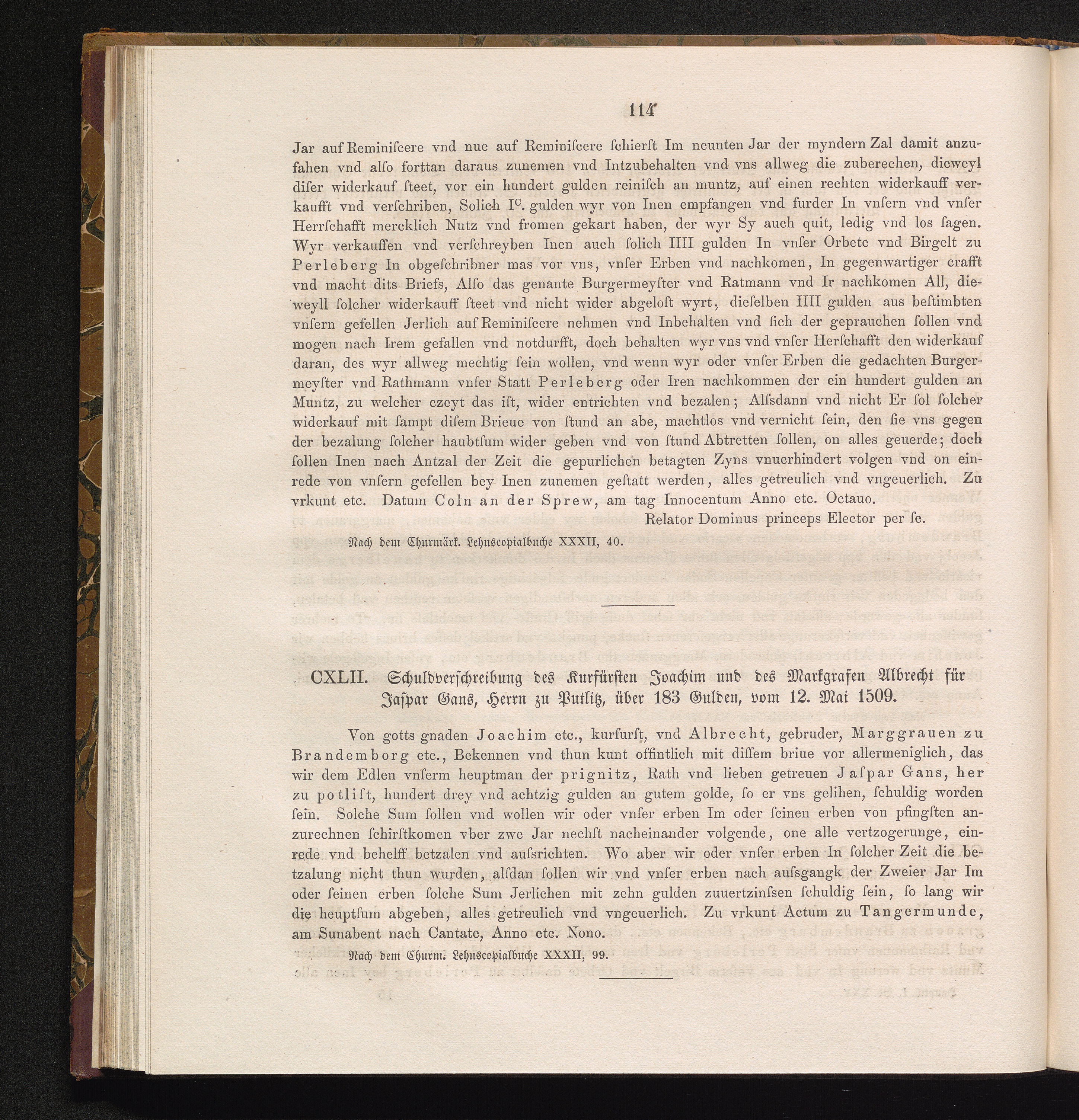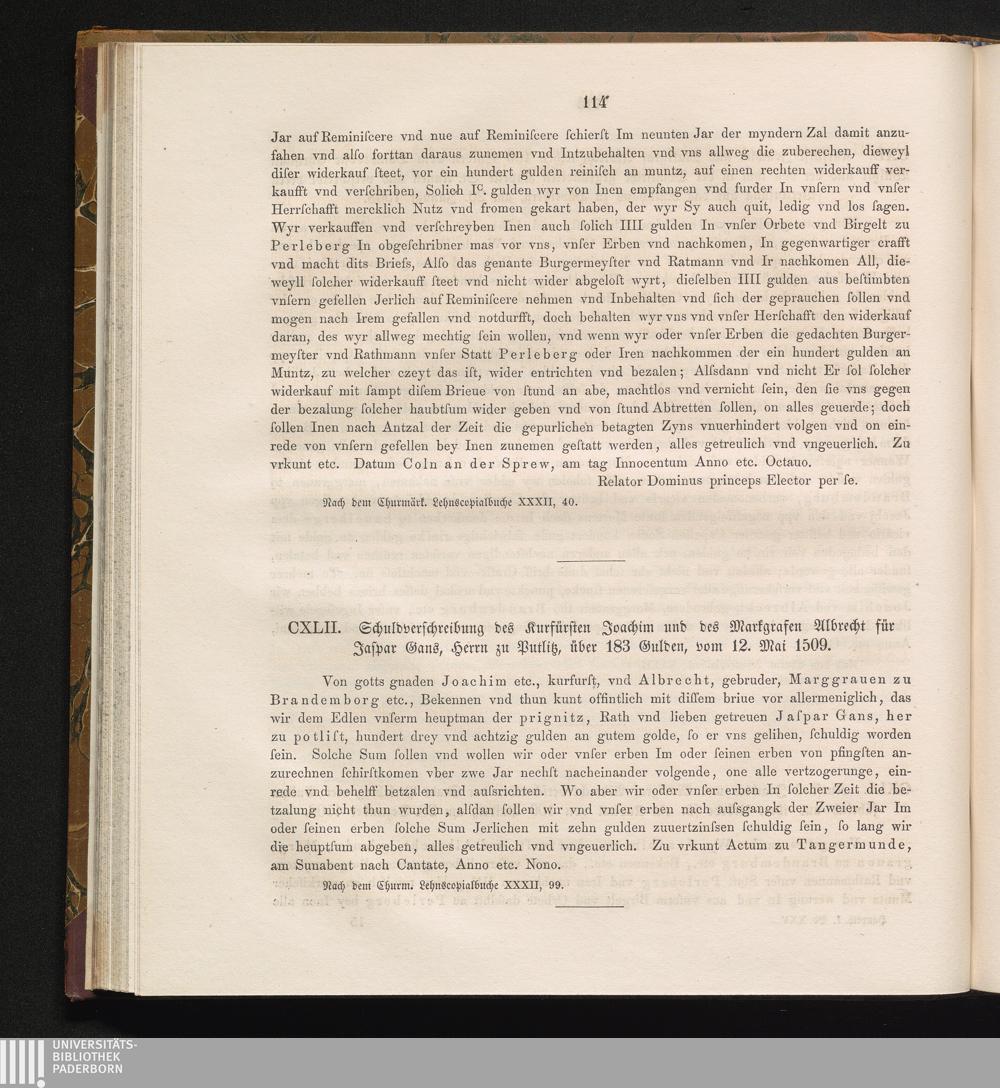 CXLII. Schuldverschreibung des Kurfürsten Joachim und des Markgrafen Albrecht für[...]
