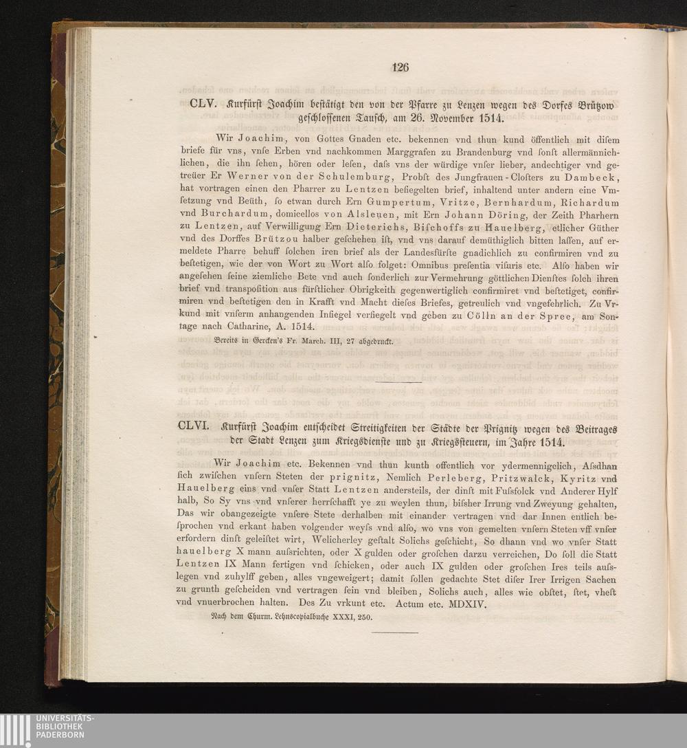 CLV. Kurfürst Joachim bestätigt den von der Pfarre zu Lenzen wegen des Dorfes Brützow[...]
