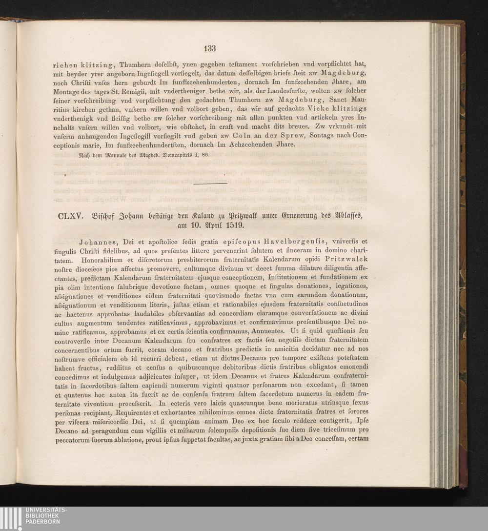 CLXV. Bischof Johann bestätigt den Kaland zu Pritzwalk unter Erneuerung des Ablasses,[...]