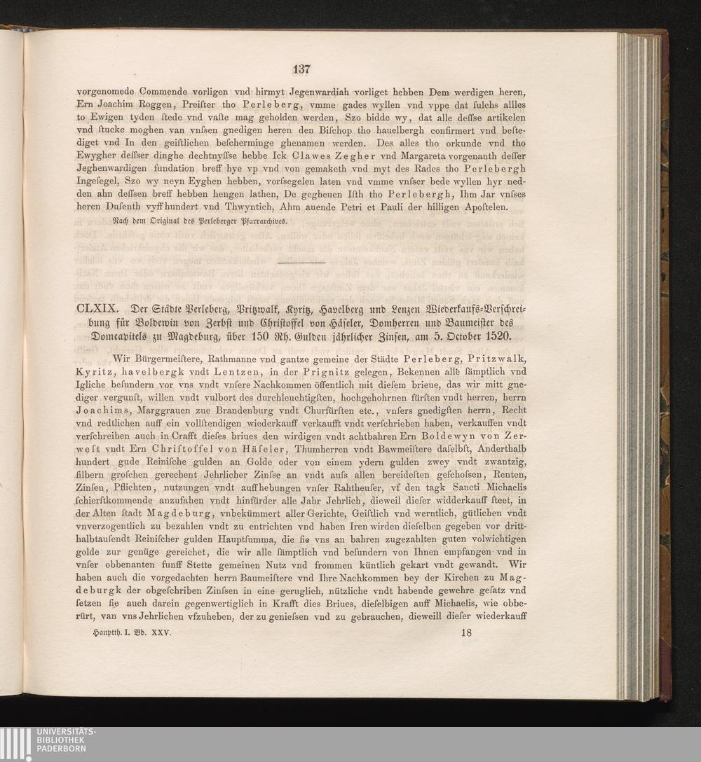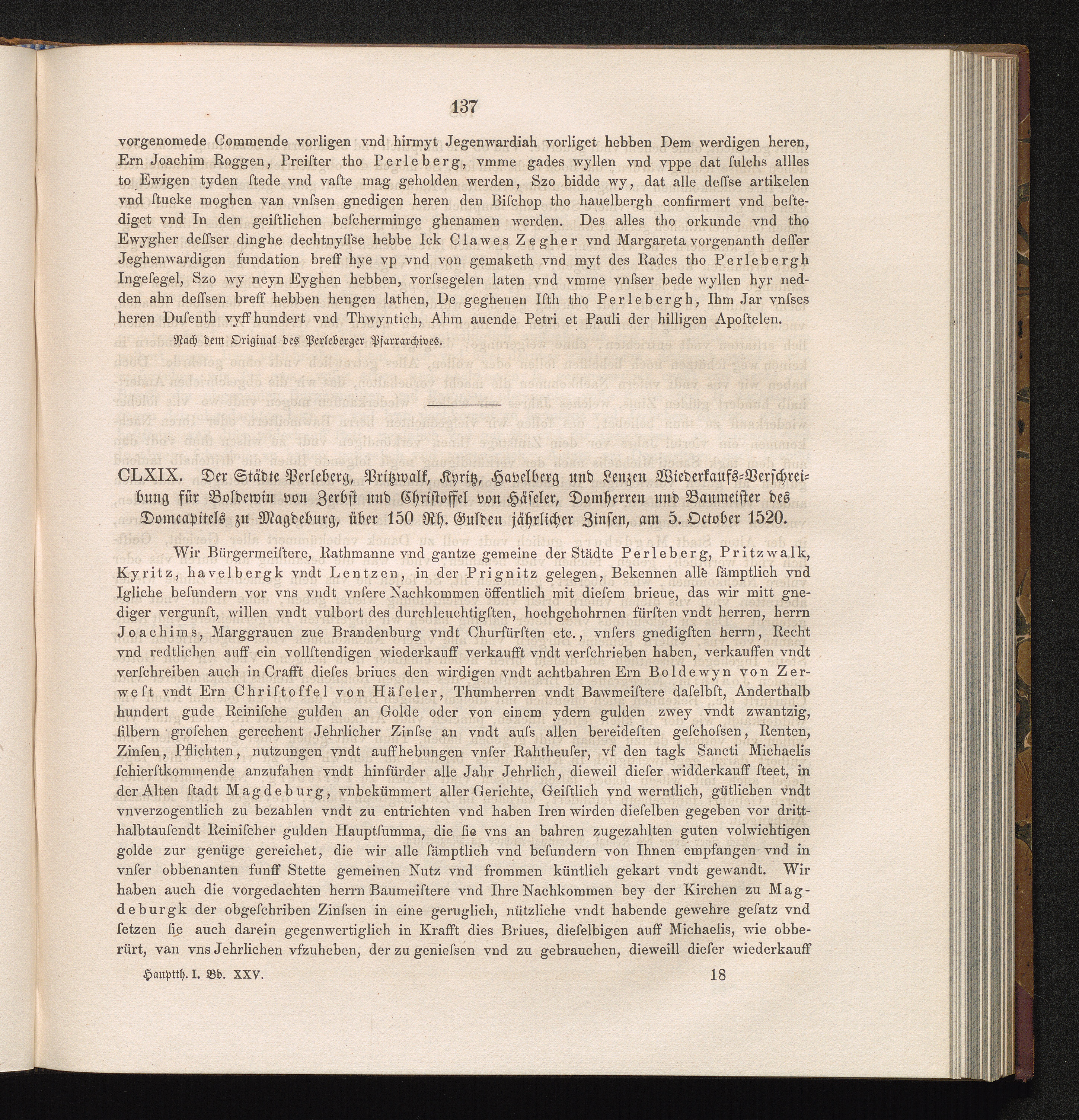 CLXIX. Der Städte Perleberg, Pritzwalk, Kyritz, Havelberg und Lenzen Wiederkaufs-Verschreibung[...]