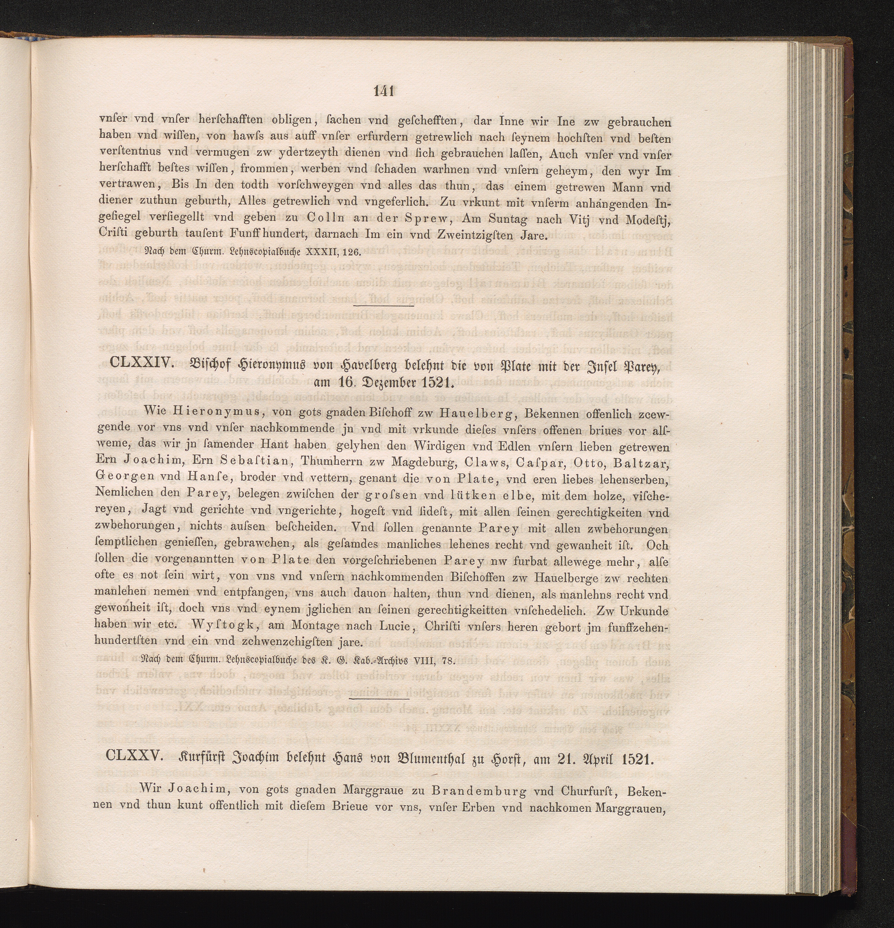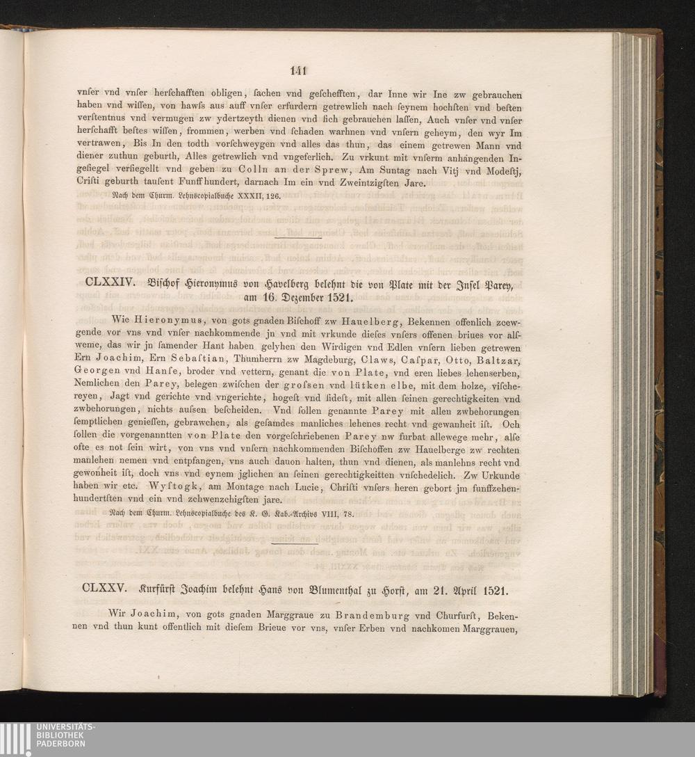 CLXXIV. Bischof Hieronymus von Havelberg belehnt die von Plate mit der Jnsel Parey,[...]