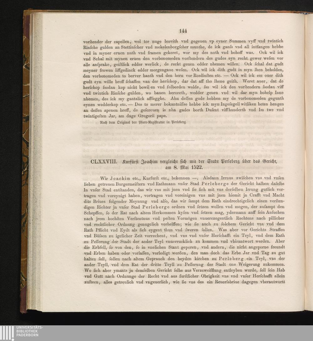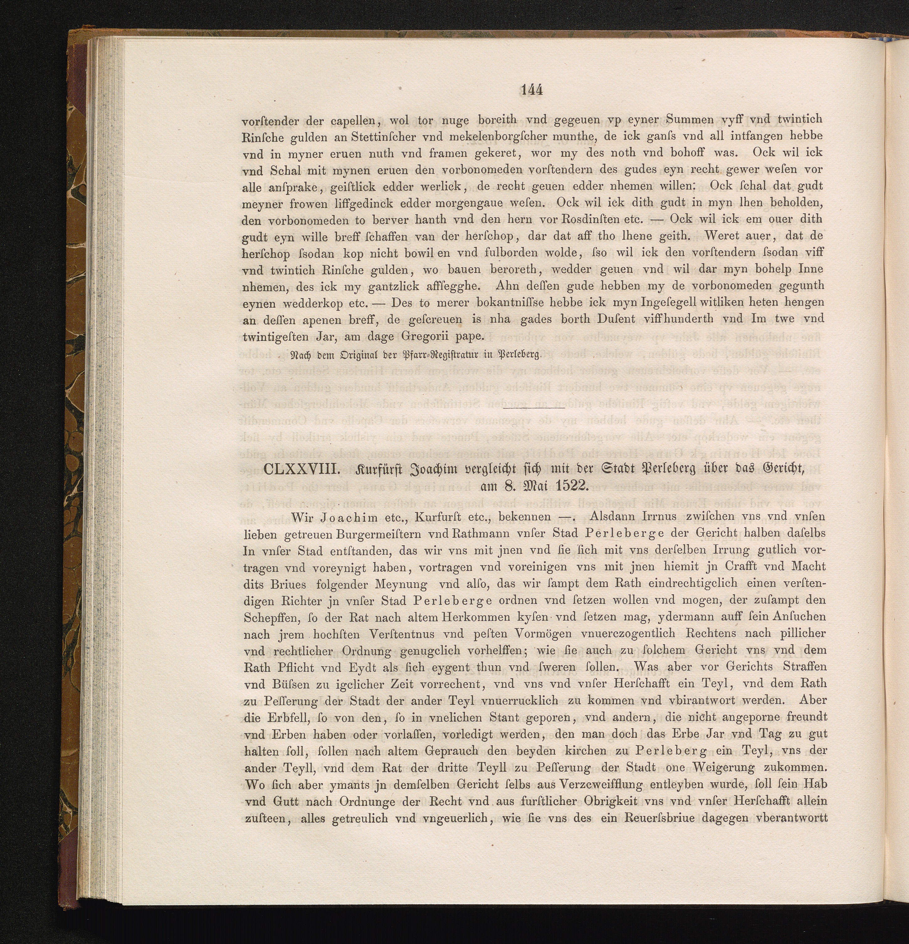 CLXXVIII. Kurfürst Joachim vergleicht sich mit der Stadt Perleberg über das Gericht,[...]