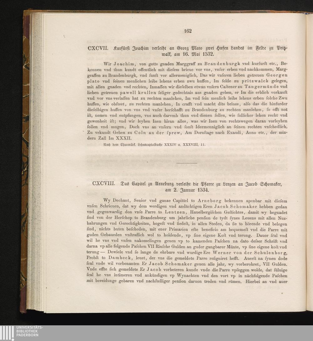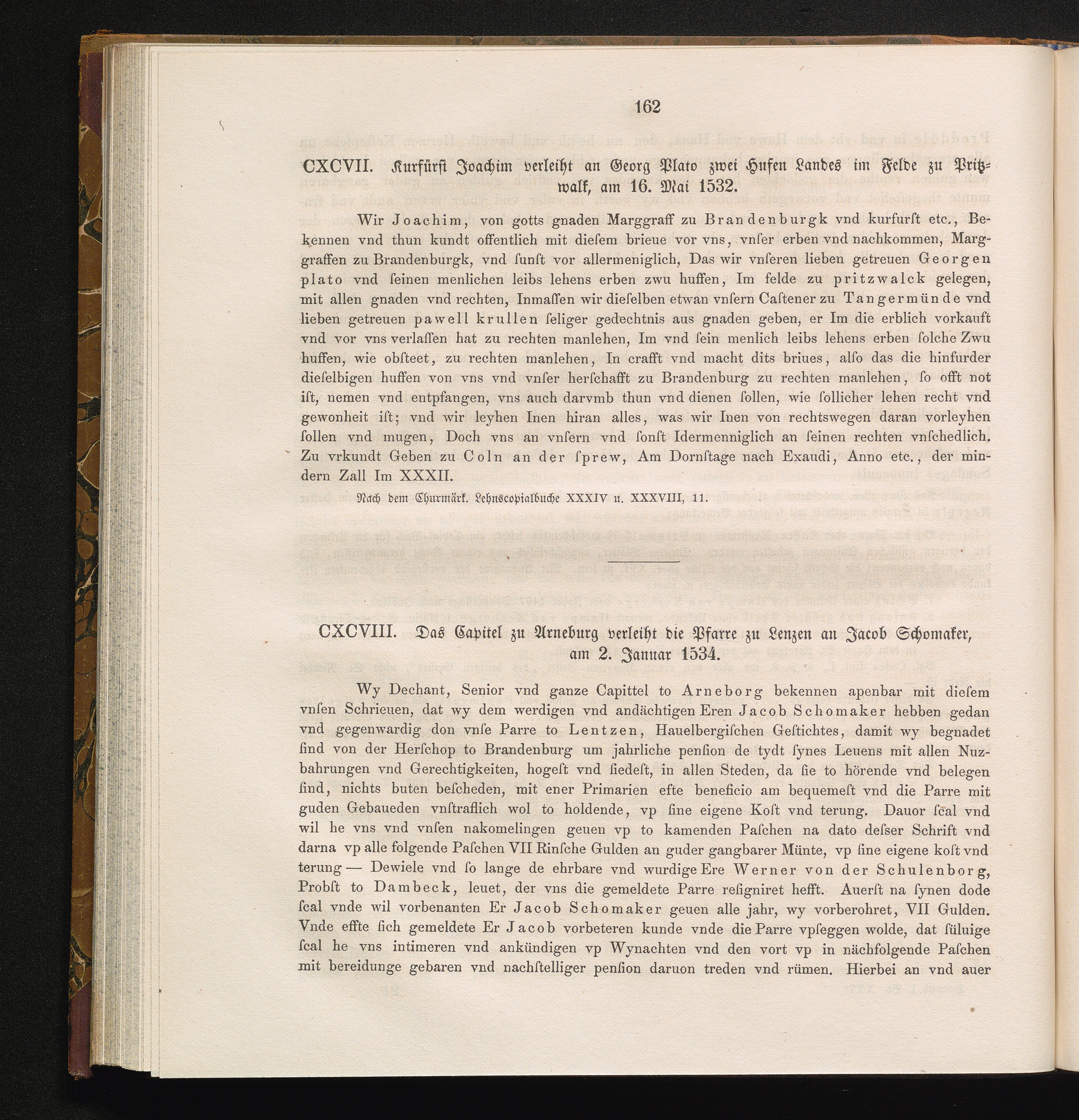 CXCVII. Kurfürst Joachim verleiht an Georg Plato zwei Hufen Landes im Felde zu Pritzwalk,[...]