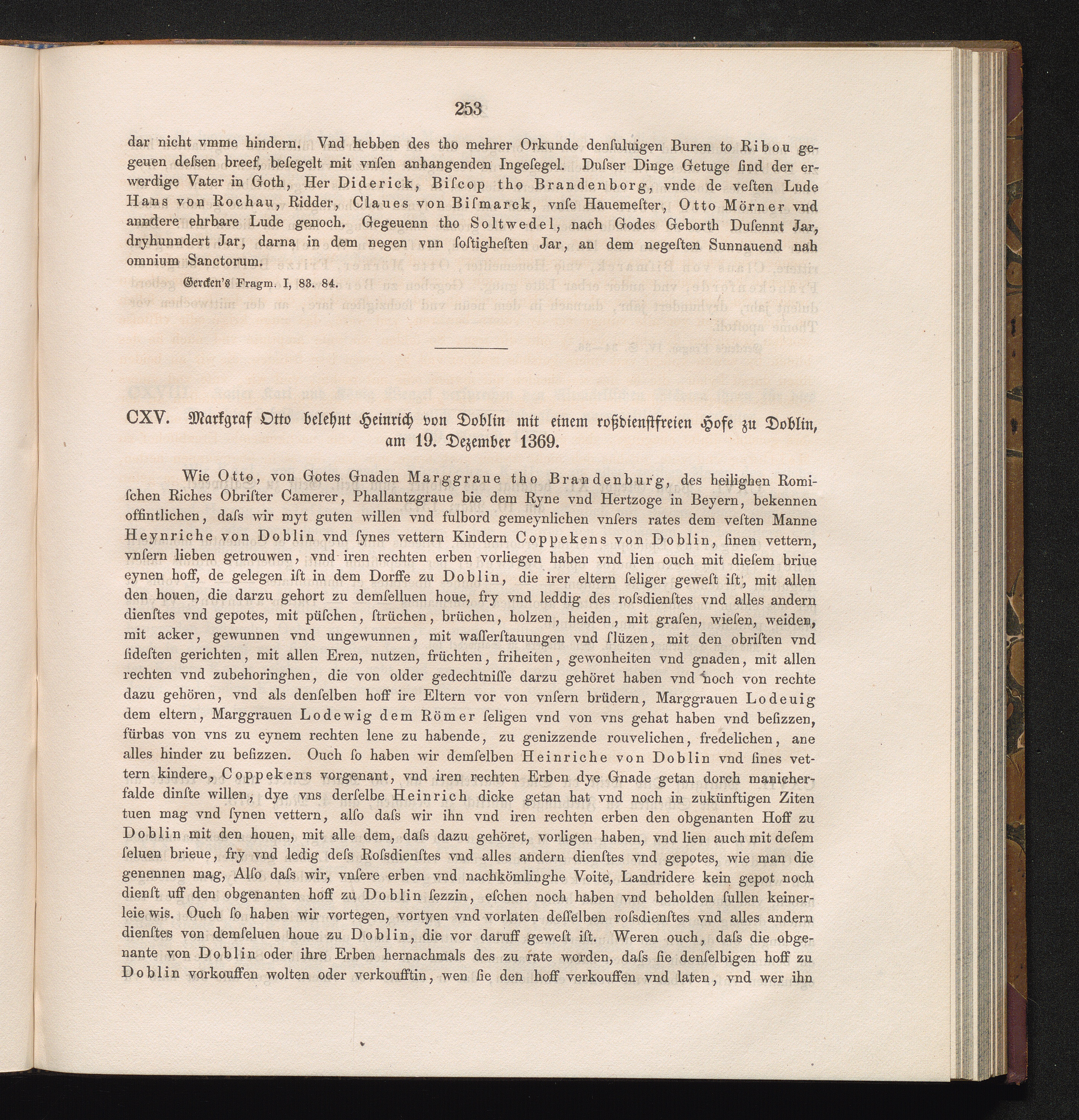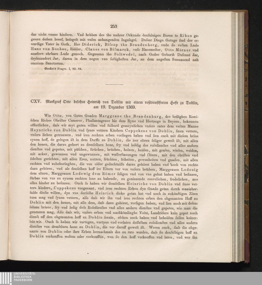 CXV. Markgraf Otto belehnt Heinrich von Doblin mit einem roßdienstfreien Hofe zu[...]