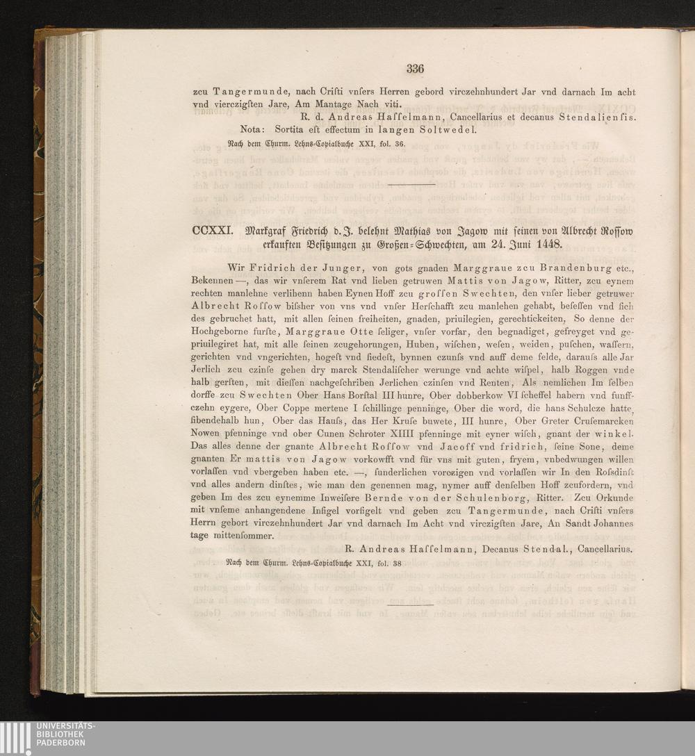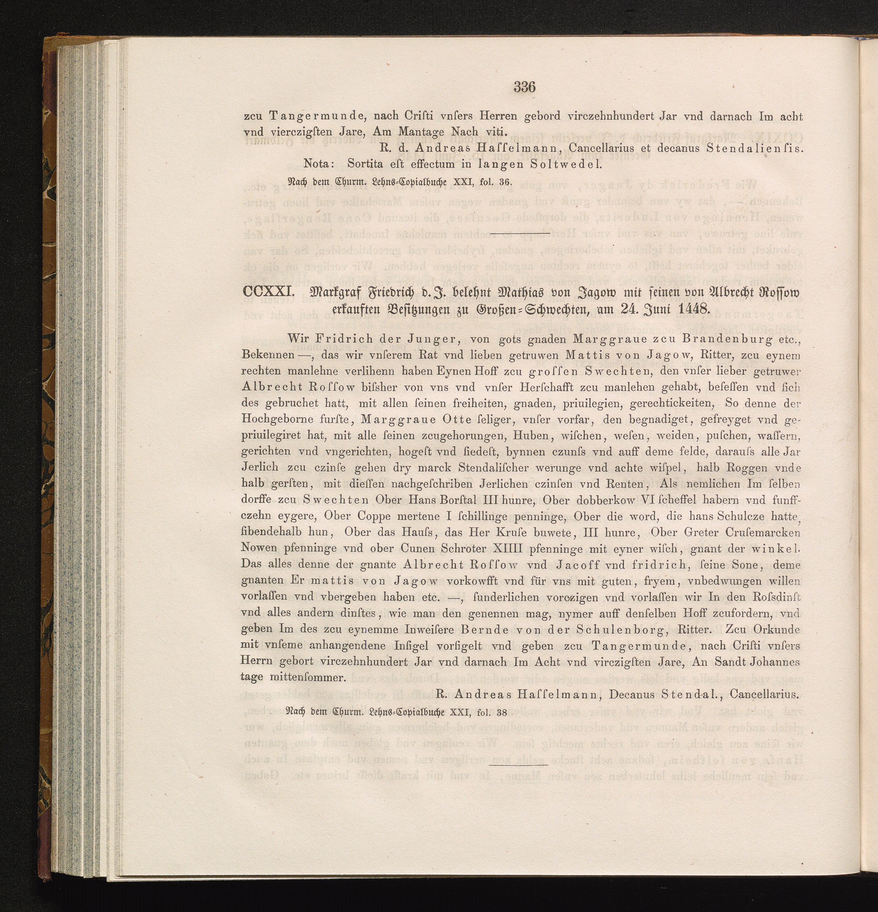 CCXXI. Markgraf Friedrich d. J. belehnt Mathias von Jagow mit seinen von Albrecht[...]