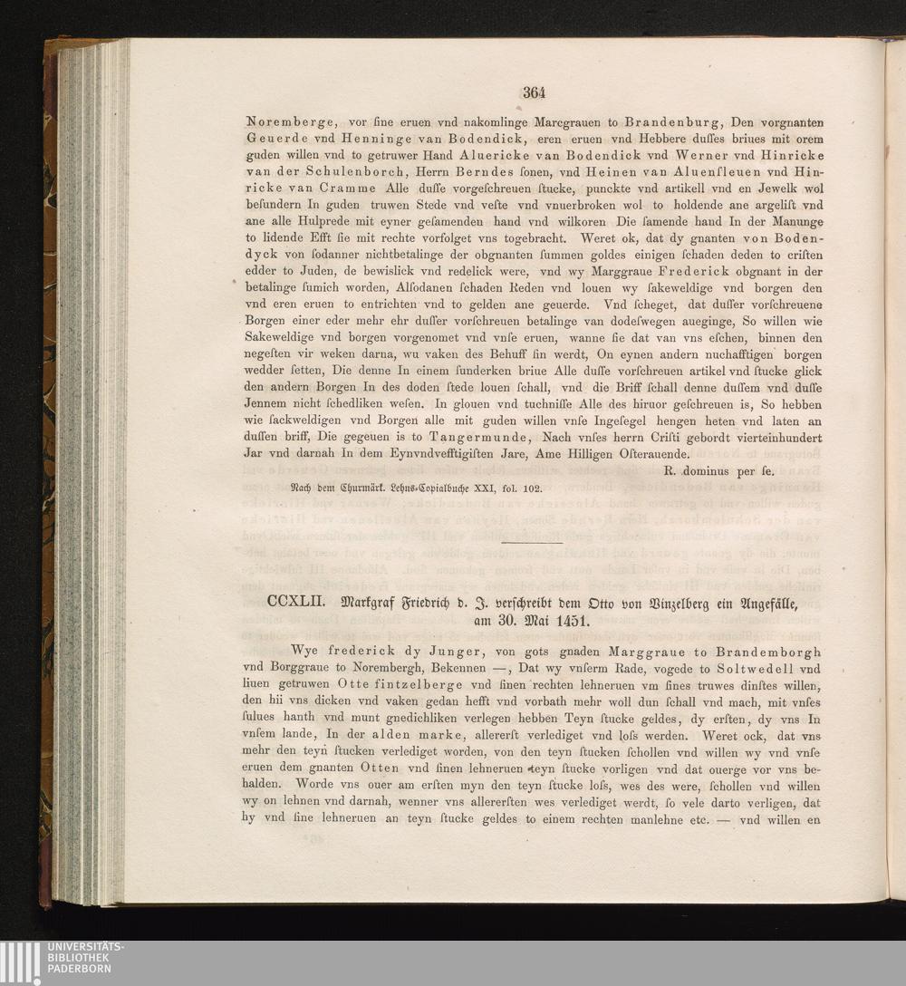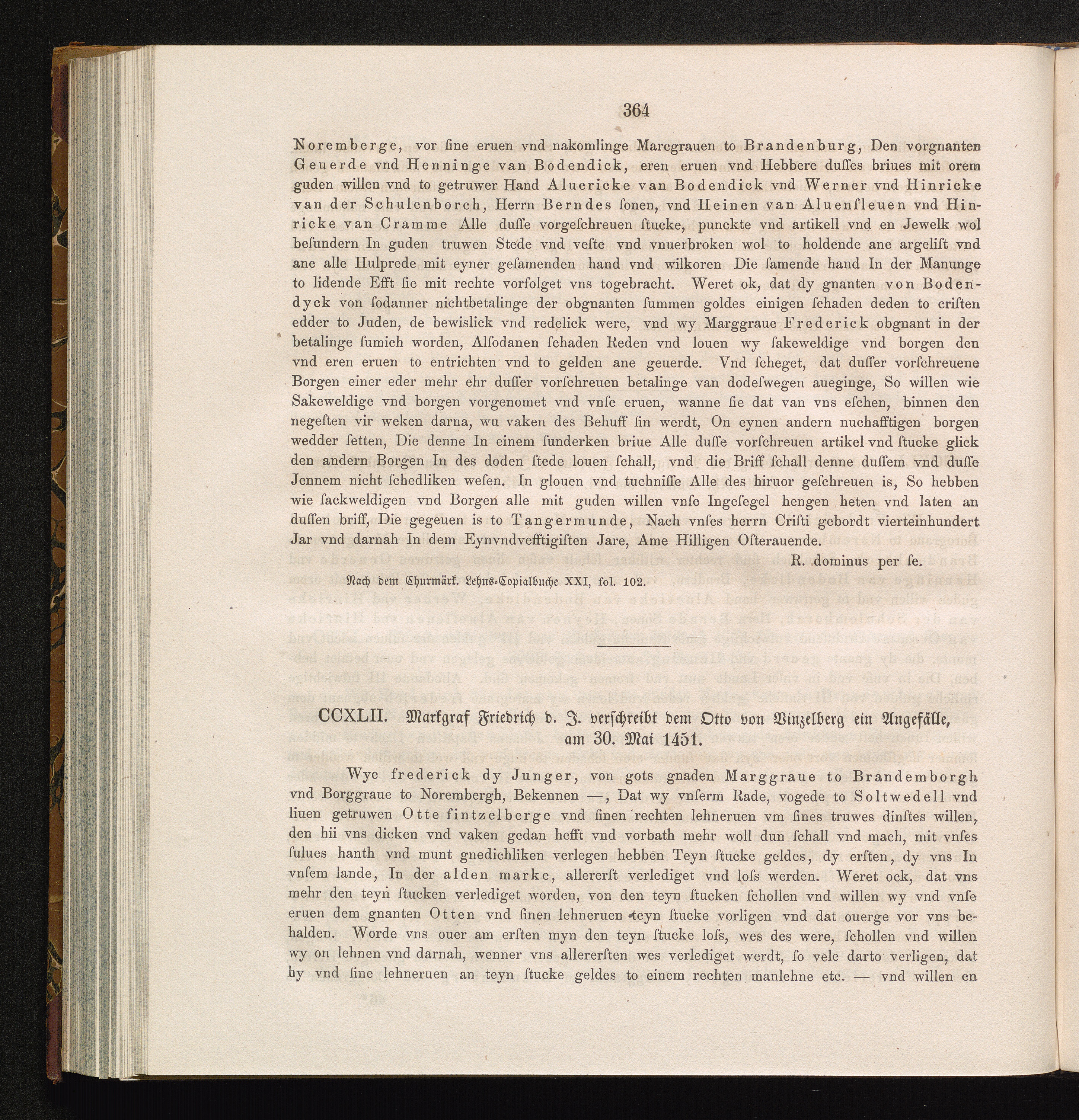 CCXLII. Markgraf Friedrich d. J. verschreibt dem Otto von Vinzelberg ein Angefälle,[...]