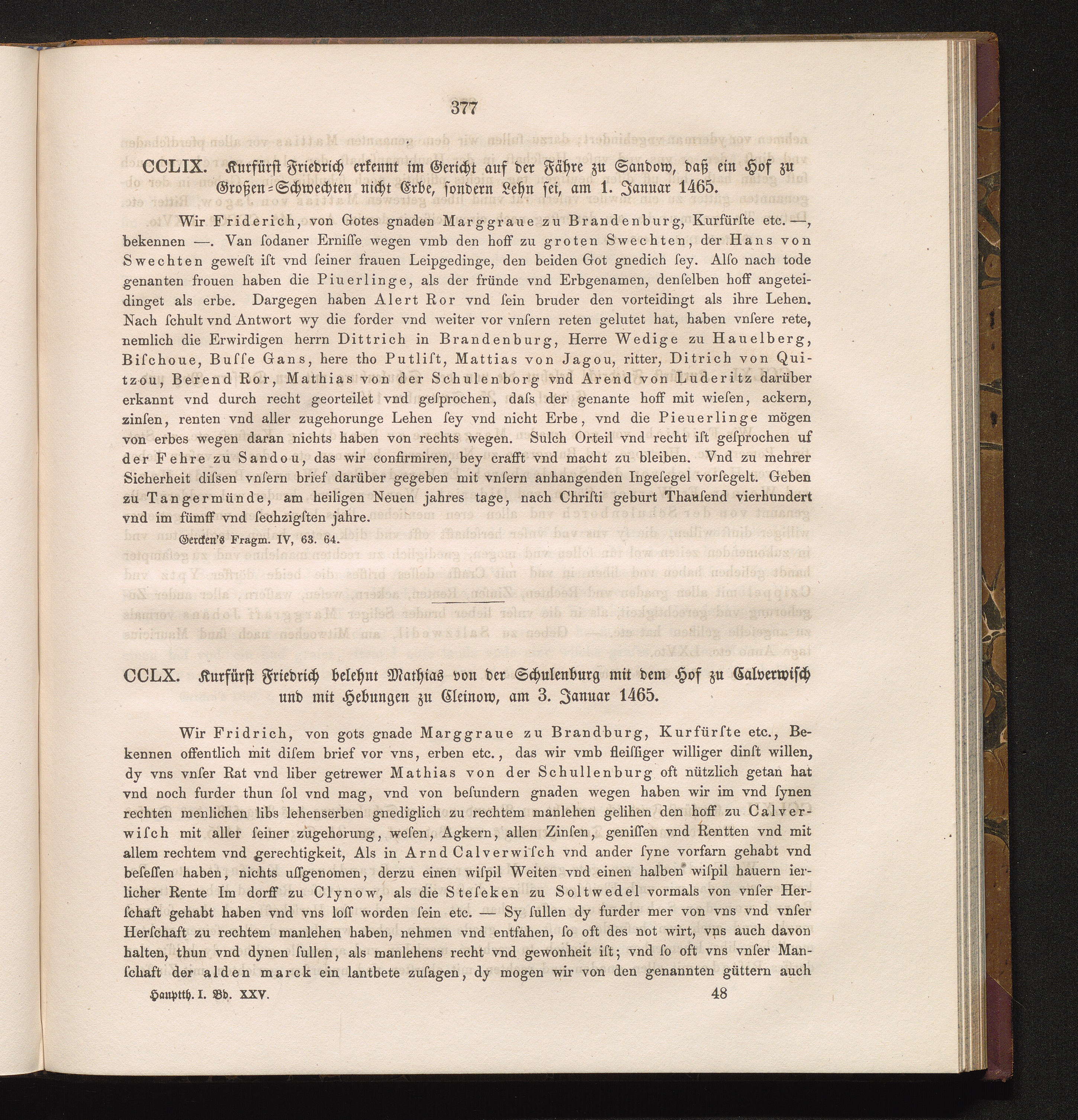 CCLIX. Kurfürst Friedrich erkennt im Gericht auf der Fähre zu Sandow, daß ein Hof[...]