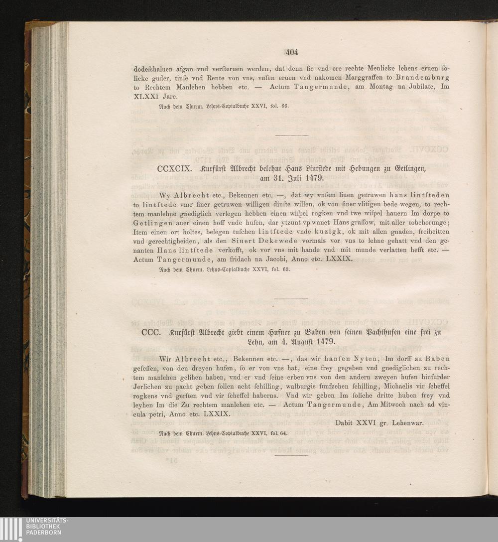 CCXCIX. Kurfürst Albrecht belehnt Hans Lintstede mit Hebungen zu Getlingen, am 31.[...]