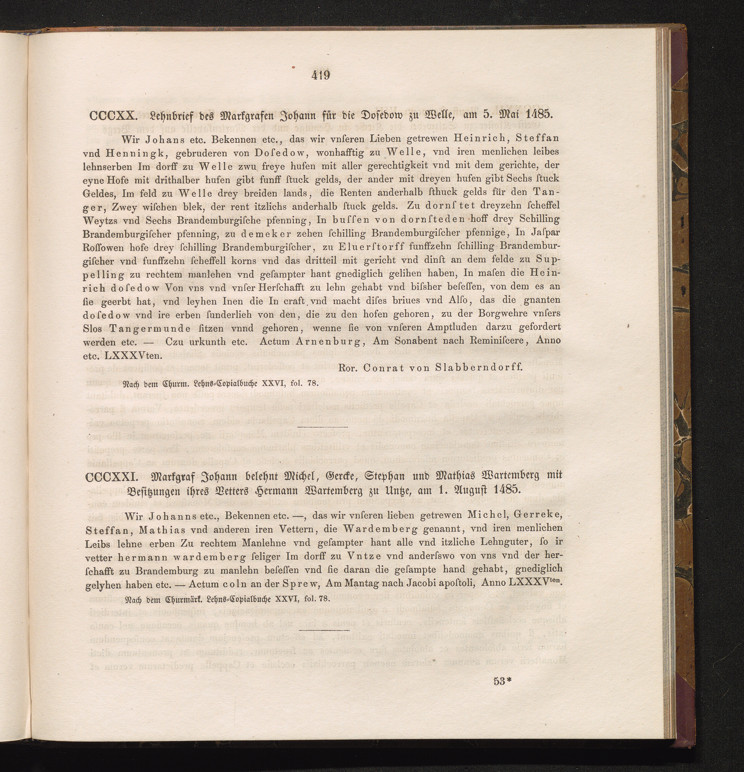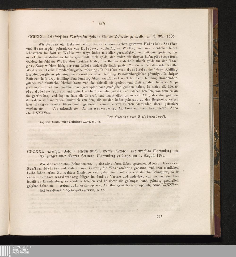 CCCXX. Lehnbrief des Markgrafen Johann für die Dosedow zu Welle, am 5. Mai 1485.