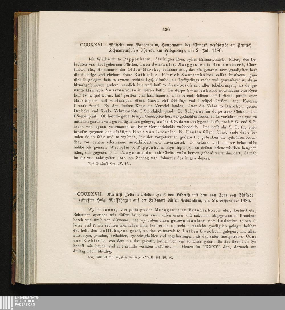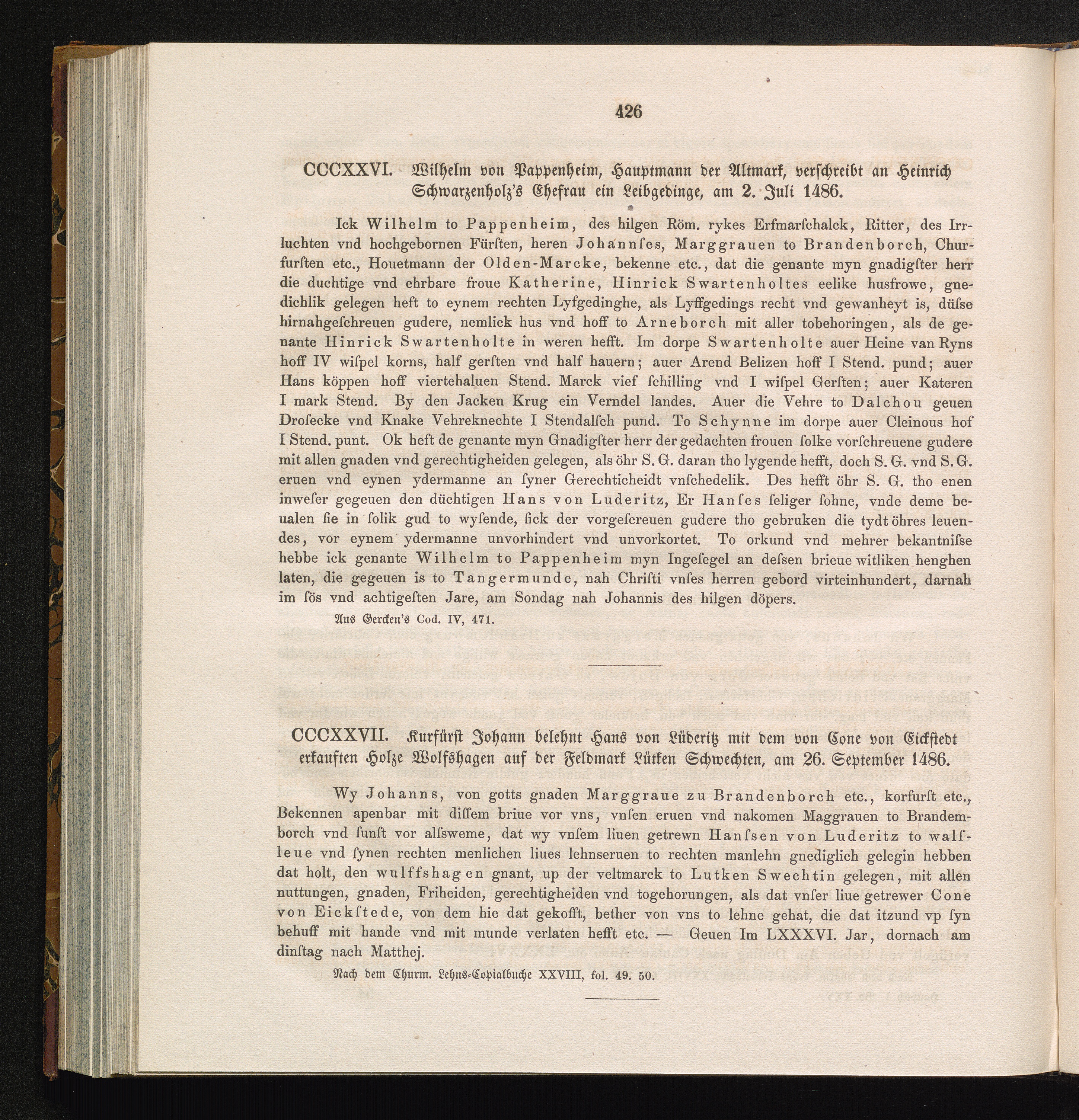 CCCXXVI. Wilhelm von Pappenheim, Hauptmann der Altmark, verschreibt an Heinrich Schwarzenholz's[...]