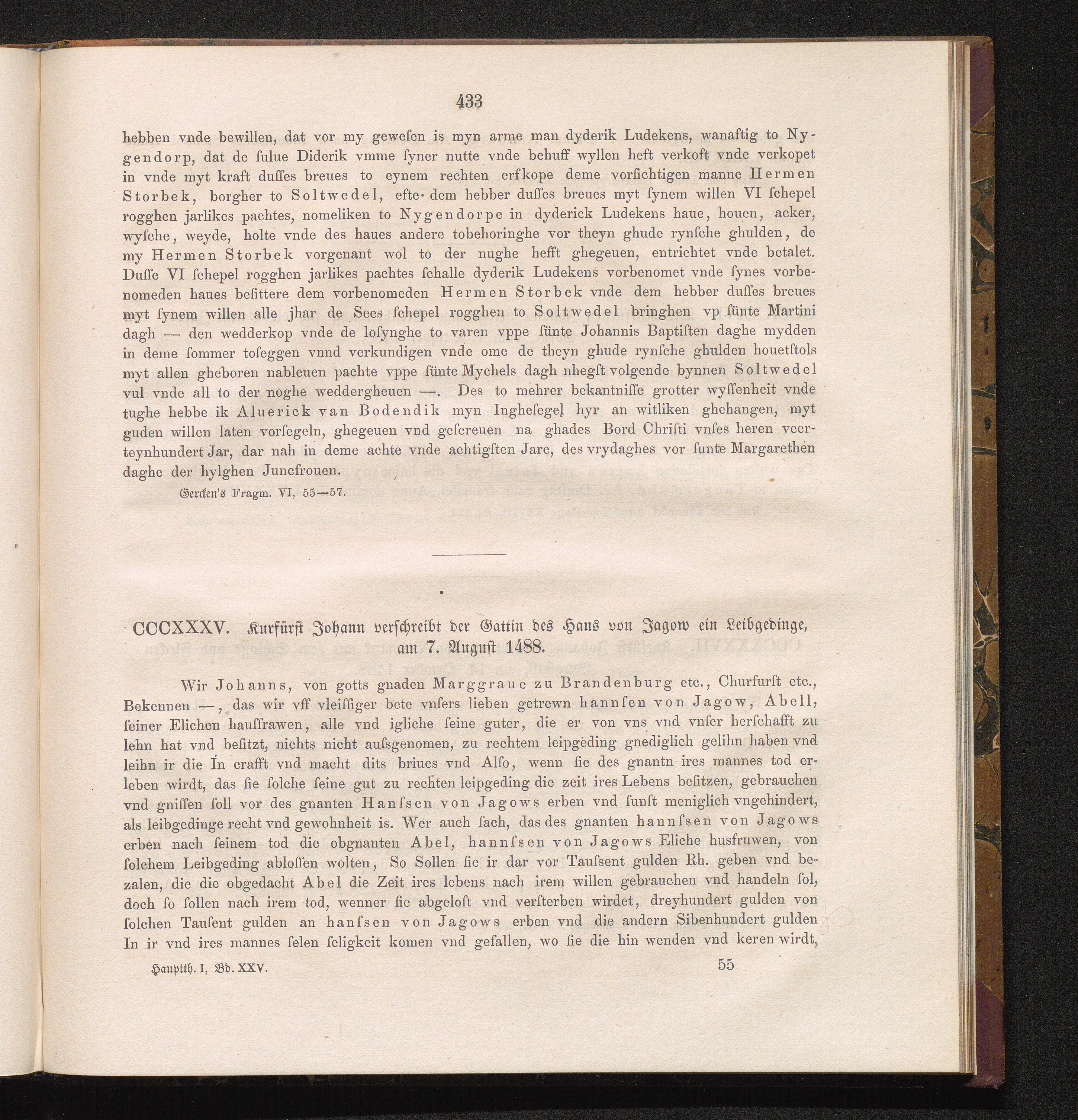 CCCXXXV. Kurfürst Johann verschreibt der Gattin des Hans von Jagow ein Leibgedinge,[...]