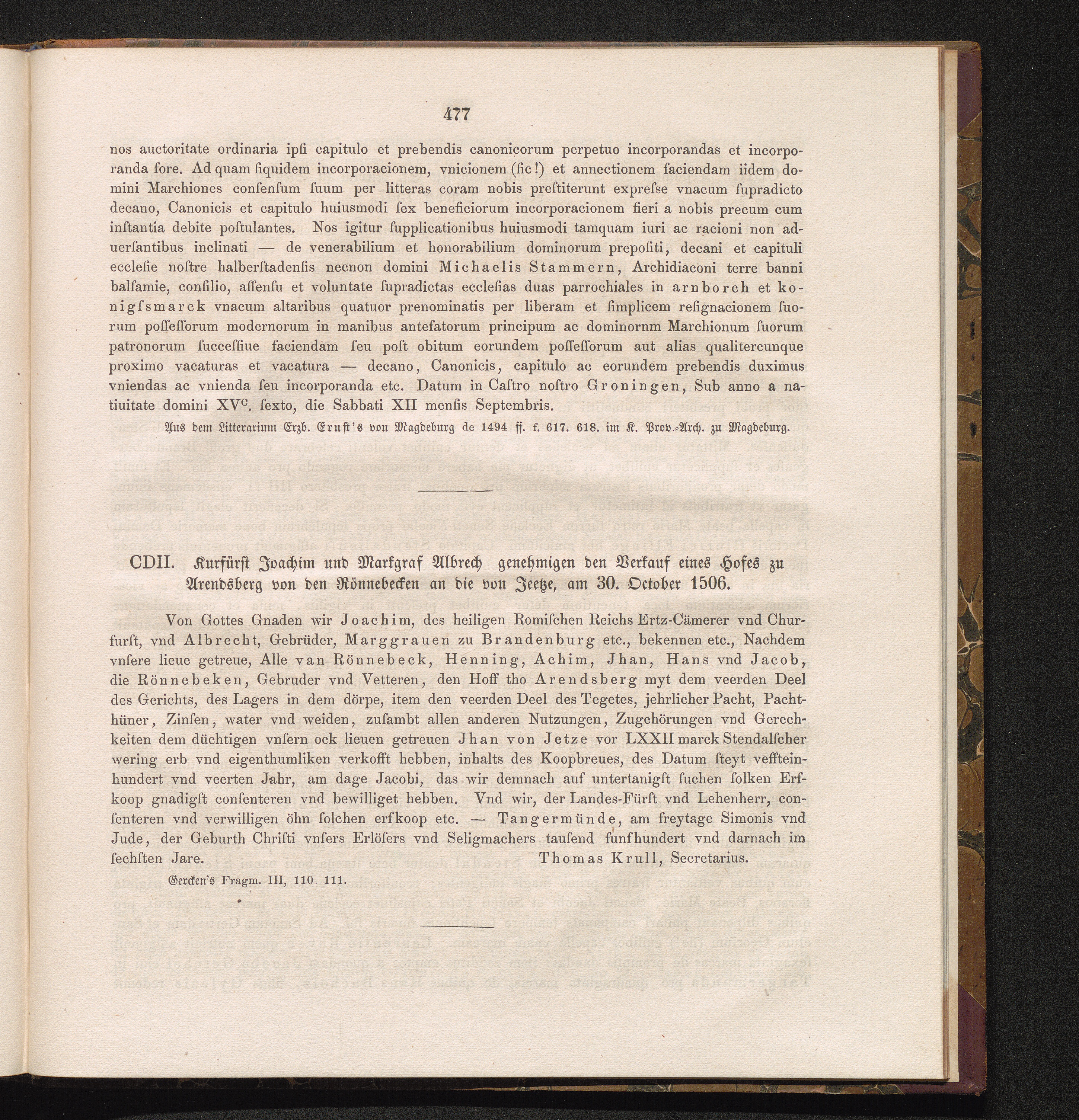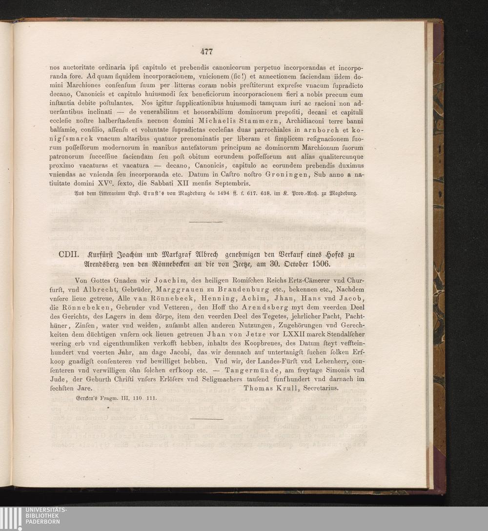 CDII. Kurfürst Joachim und Markgraf Albrech[t] genehmigen den Verkauf eines Hofes[...]
