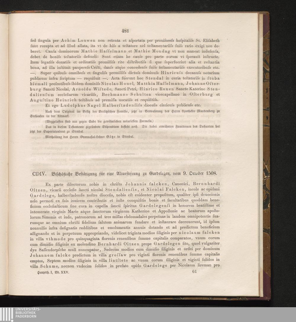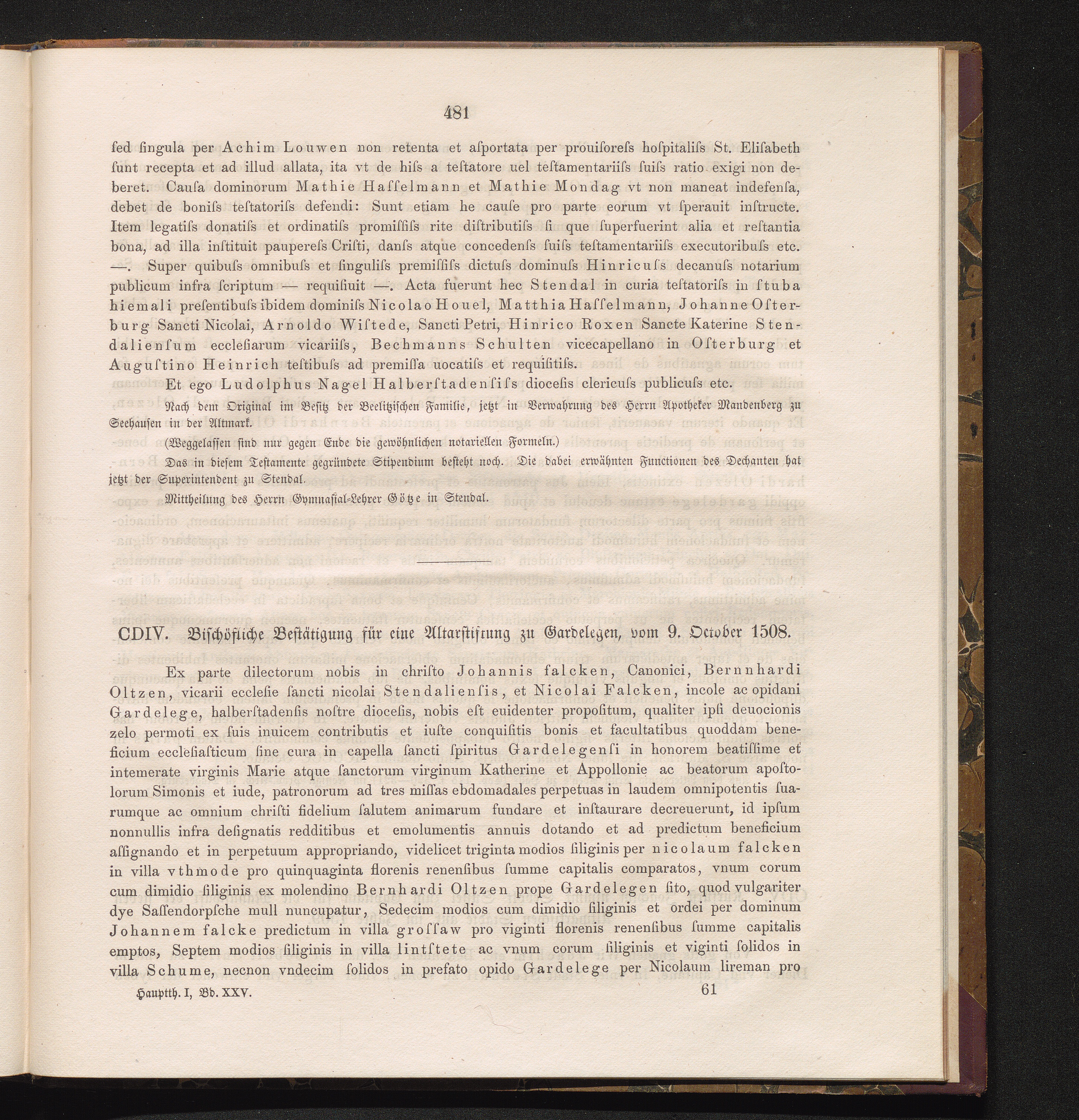 CDIV. Bischöfliche Bestätigung für eine Altarstiftung zu Gardelegen, vom 9. October[...]
