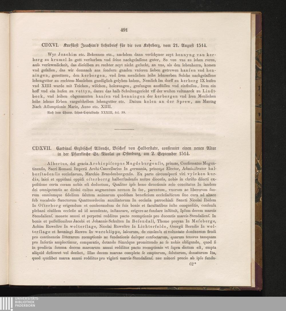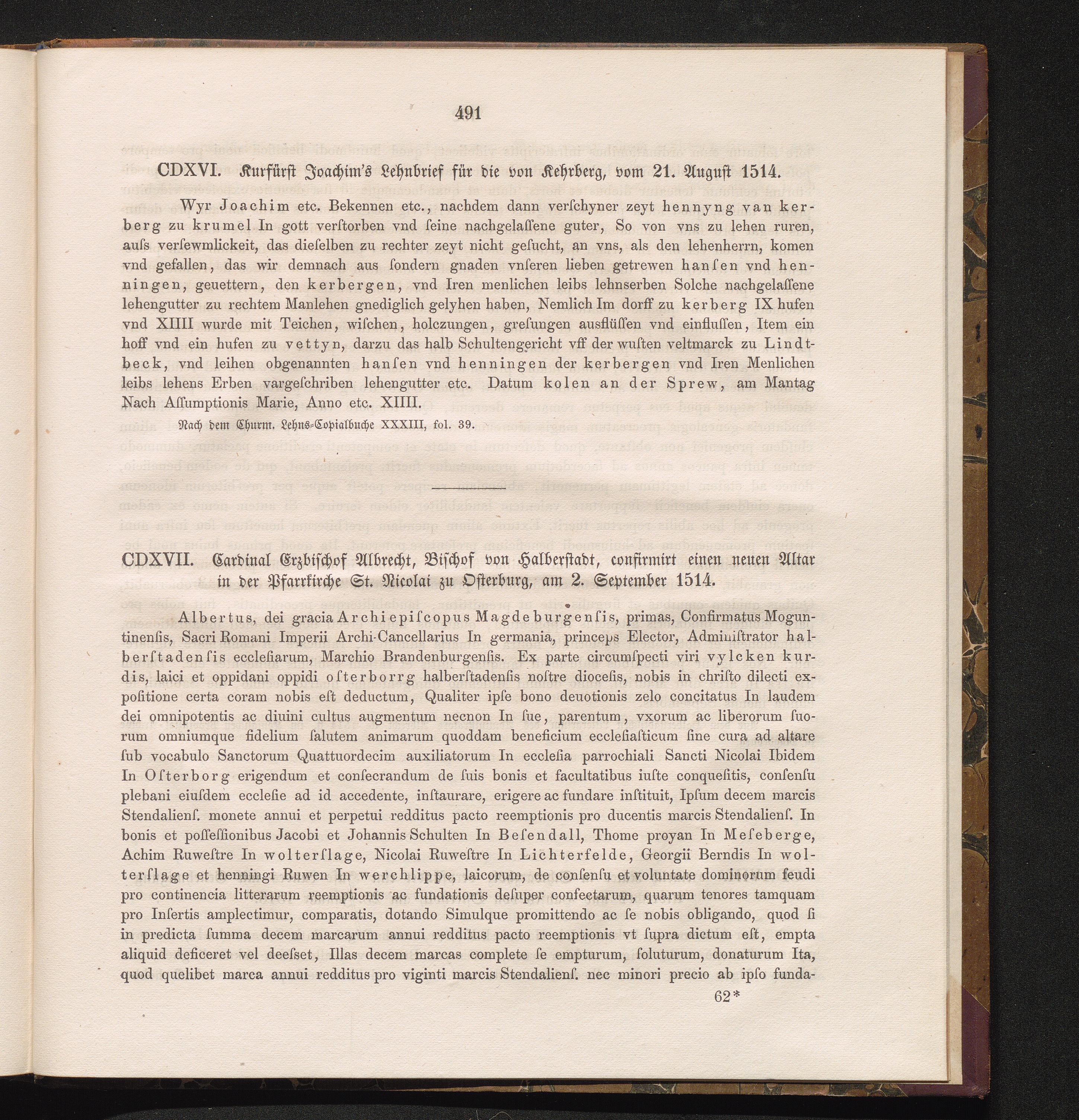 CDXVI. Kurfürst Joachim's Lehnbrief für die von Kehrberg, vom 21. August 1514.