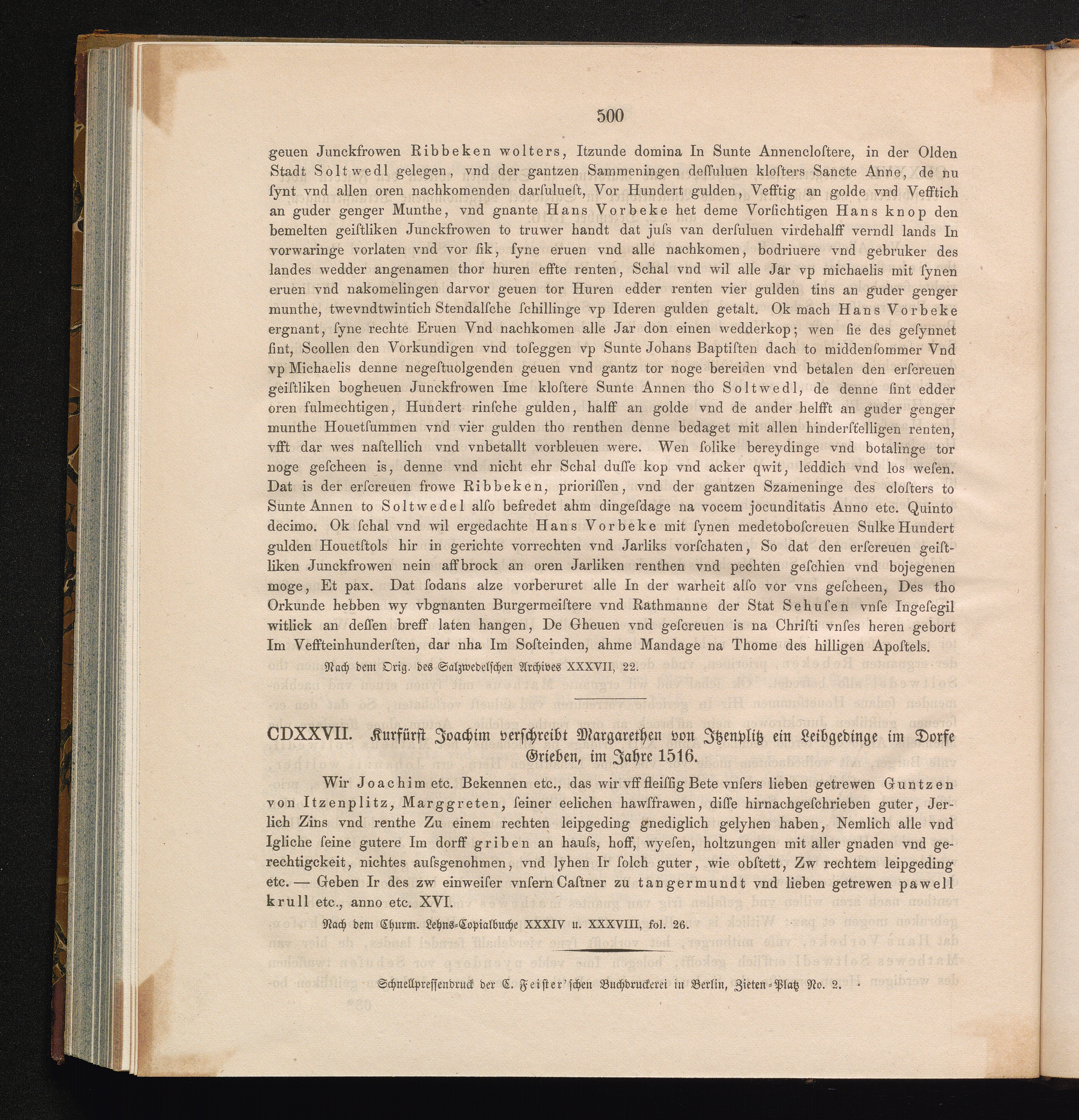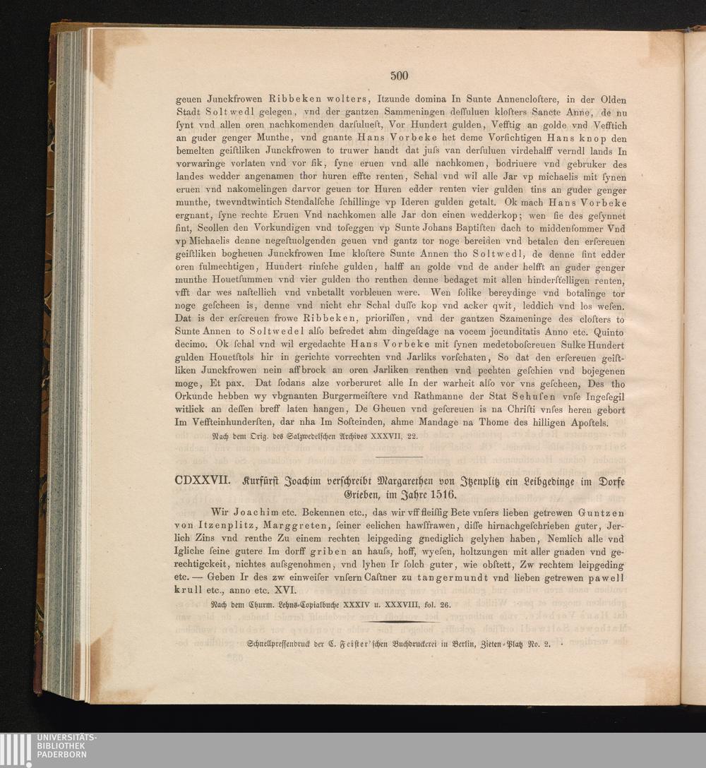 CDXXVII. Kurfürst Joachim verschreibt Margarethen von Jtzenplitz ein Liebgedinge[...]