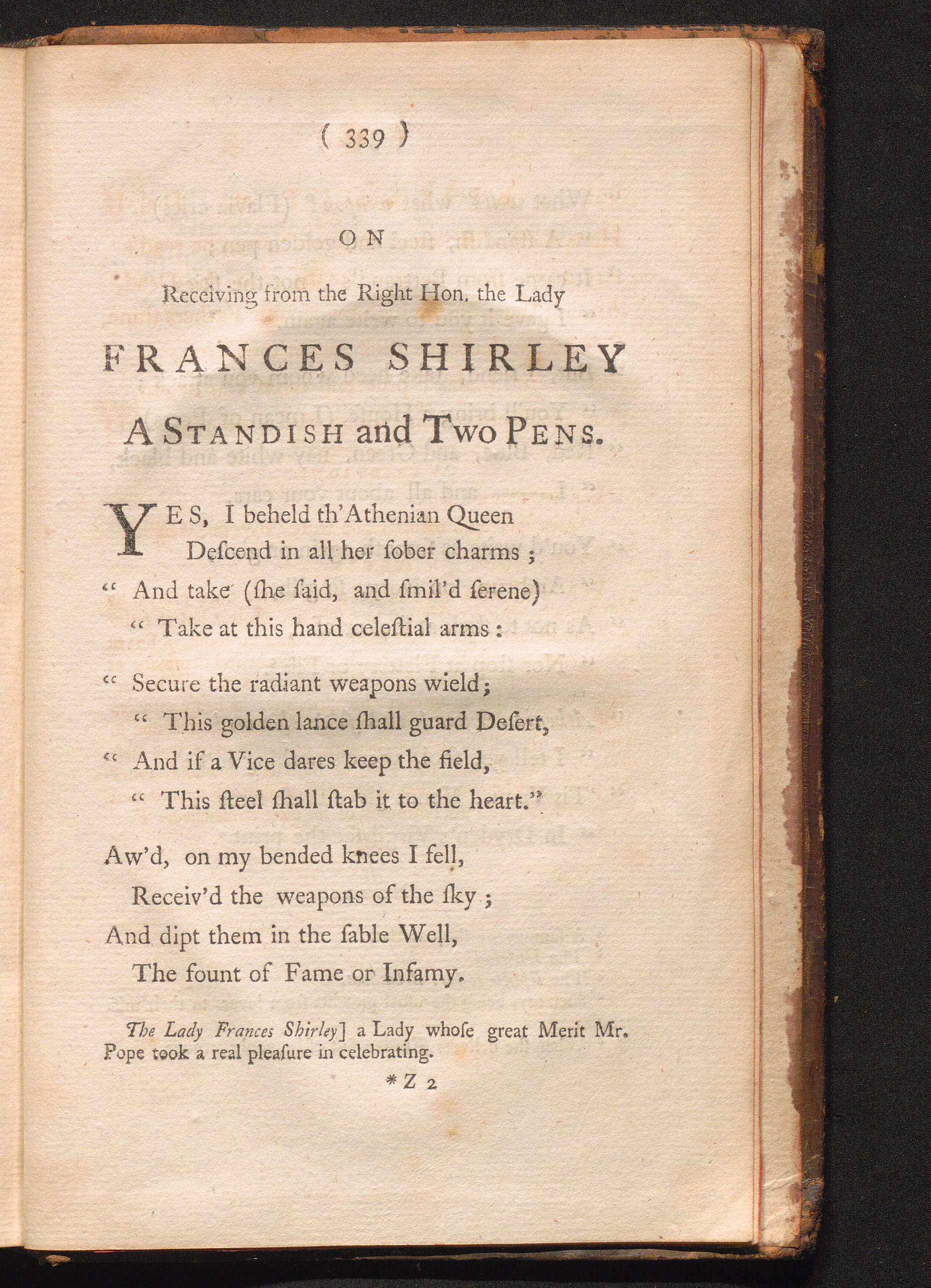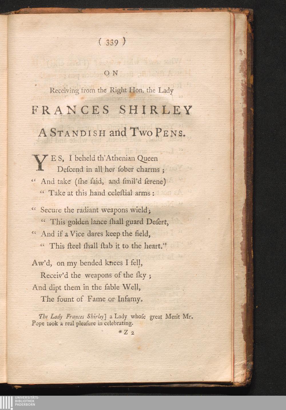 On receiving from the Right Honourable the Lady Frances Shirley, a standish and two[...]