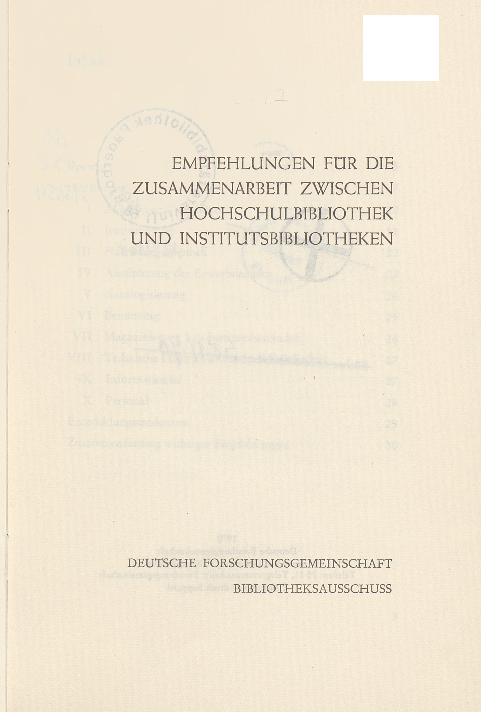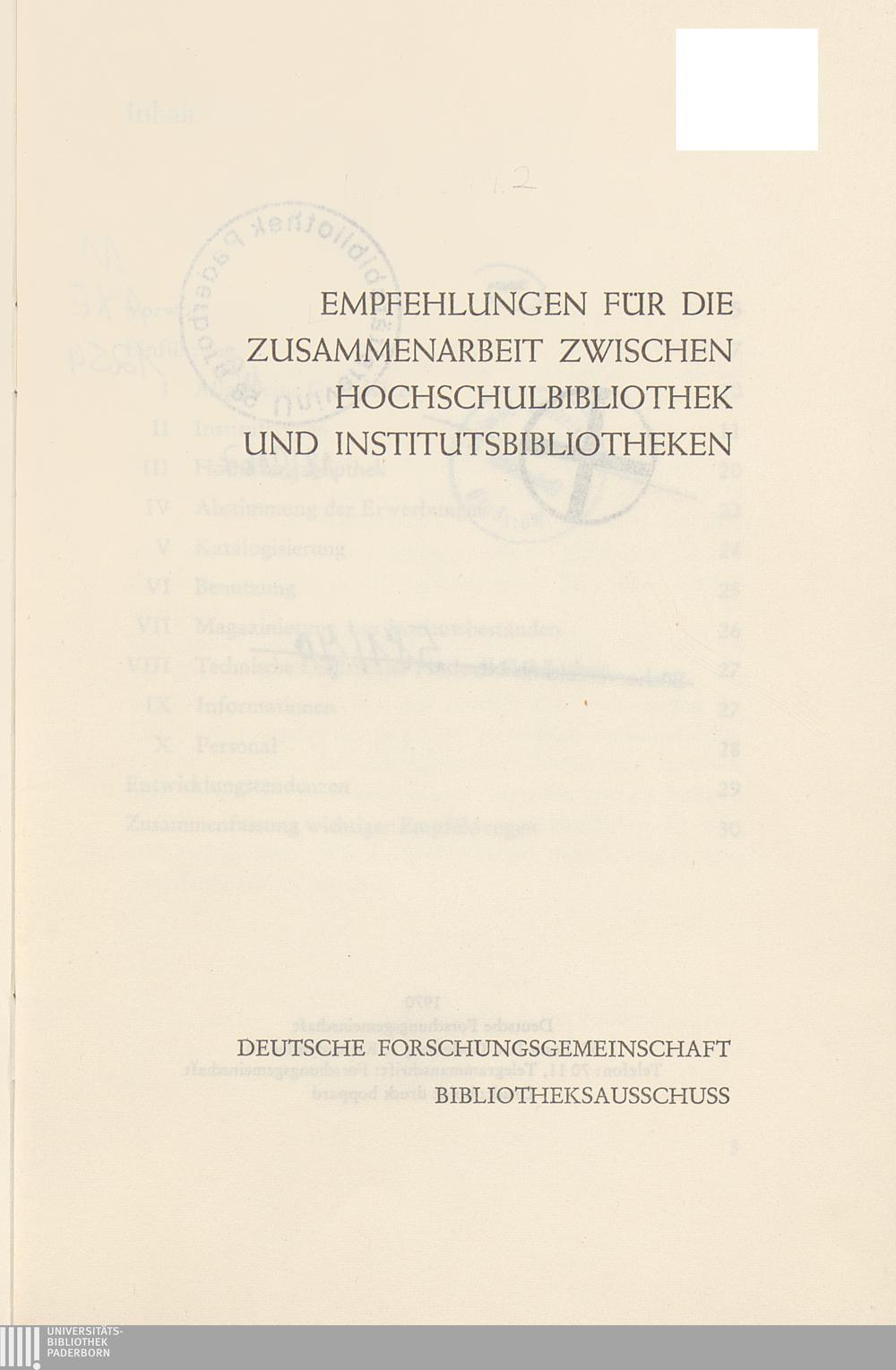 Empfehlungen für die Zusammenarbeit zwischen Hochschulbibliothek und Institutsbibliotheken / Deutsche Forschungsgemeinschaft, Bibliotheksausschuß