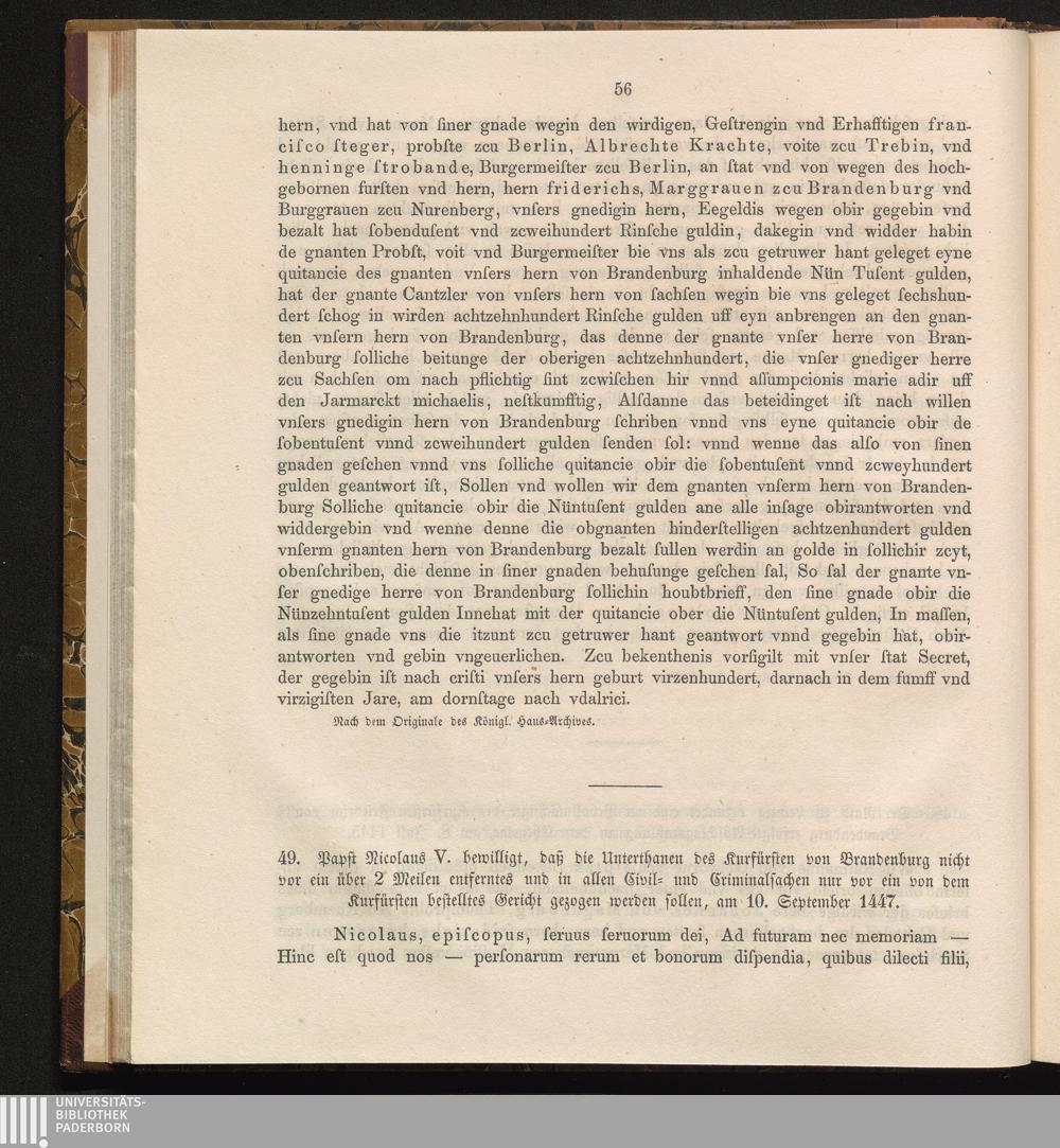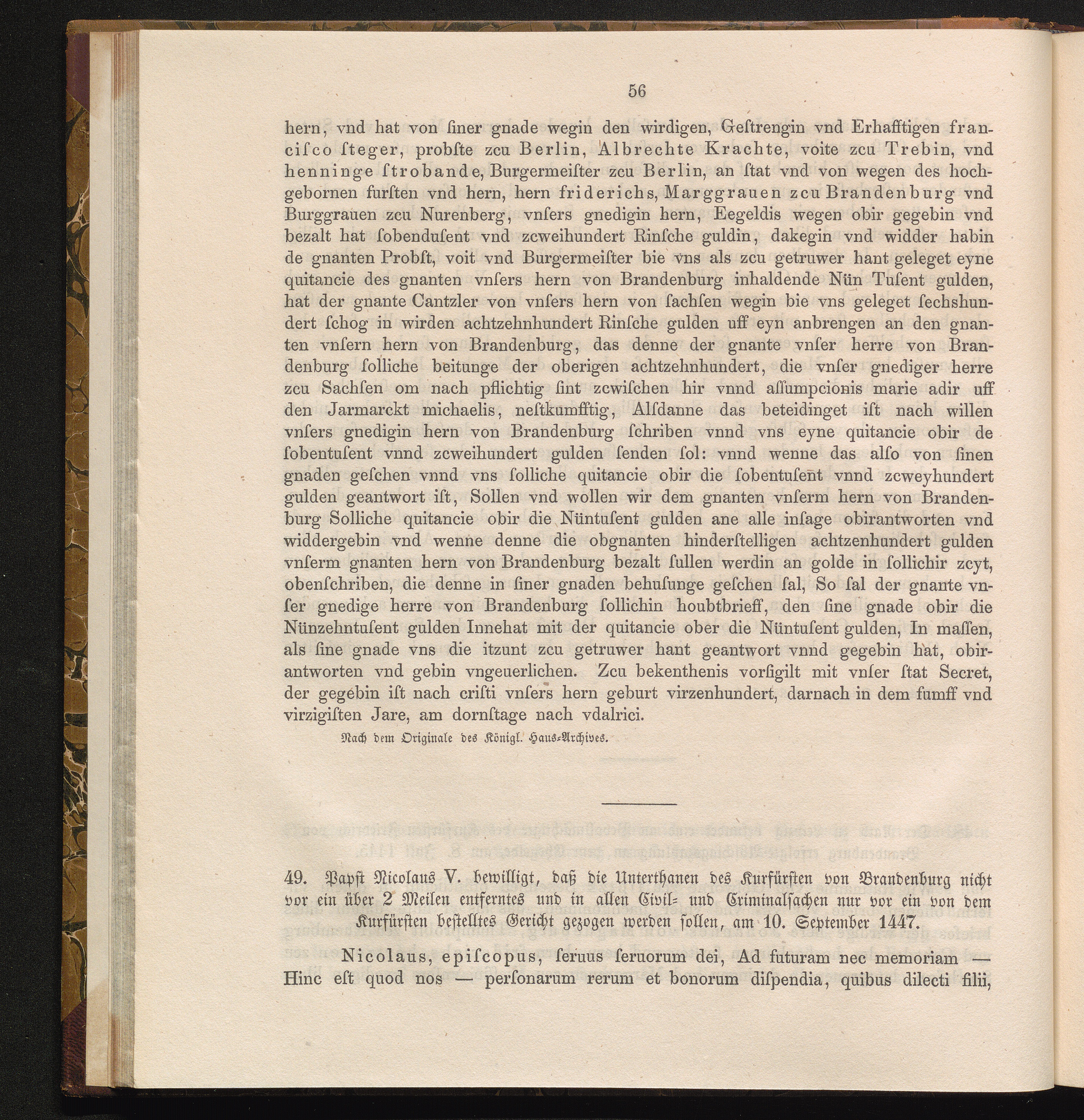 49. Papst Nicolaus V. bewilligt, daß die Unterthanen des Kurfürsten von Brandenburg[...]