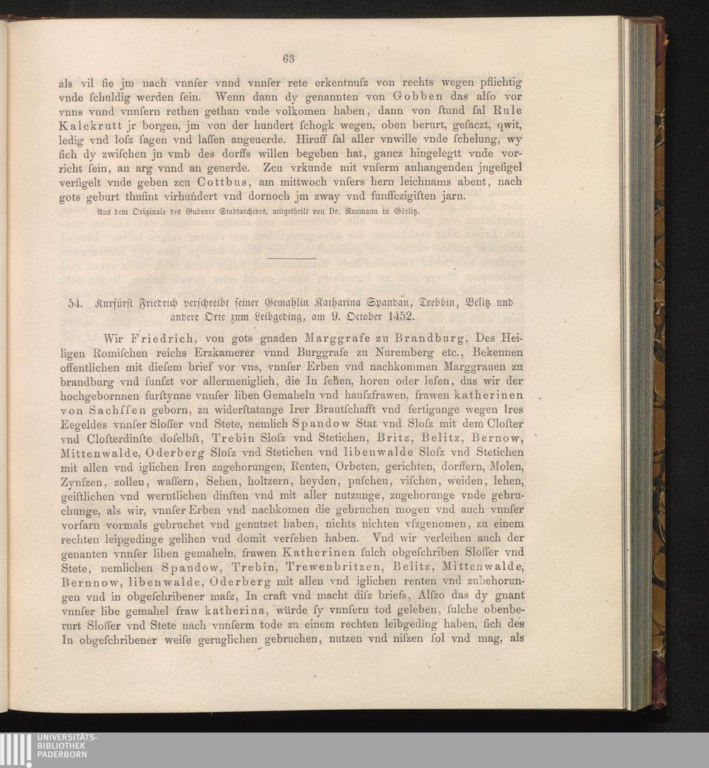 54. Kurfürst Friedrich verschreibt seiner Gemahlin Katharina Spandau, Trebbin, Belitz[...]