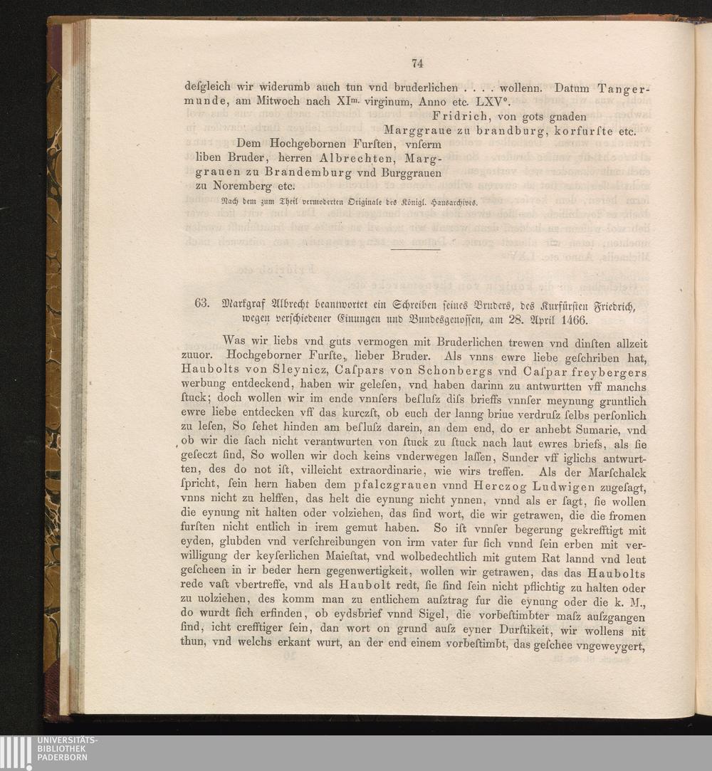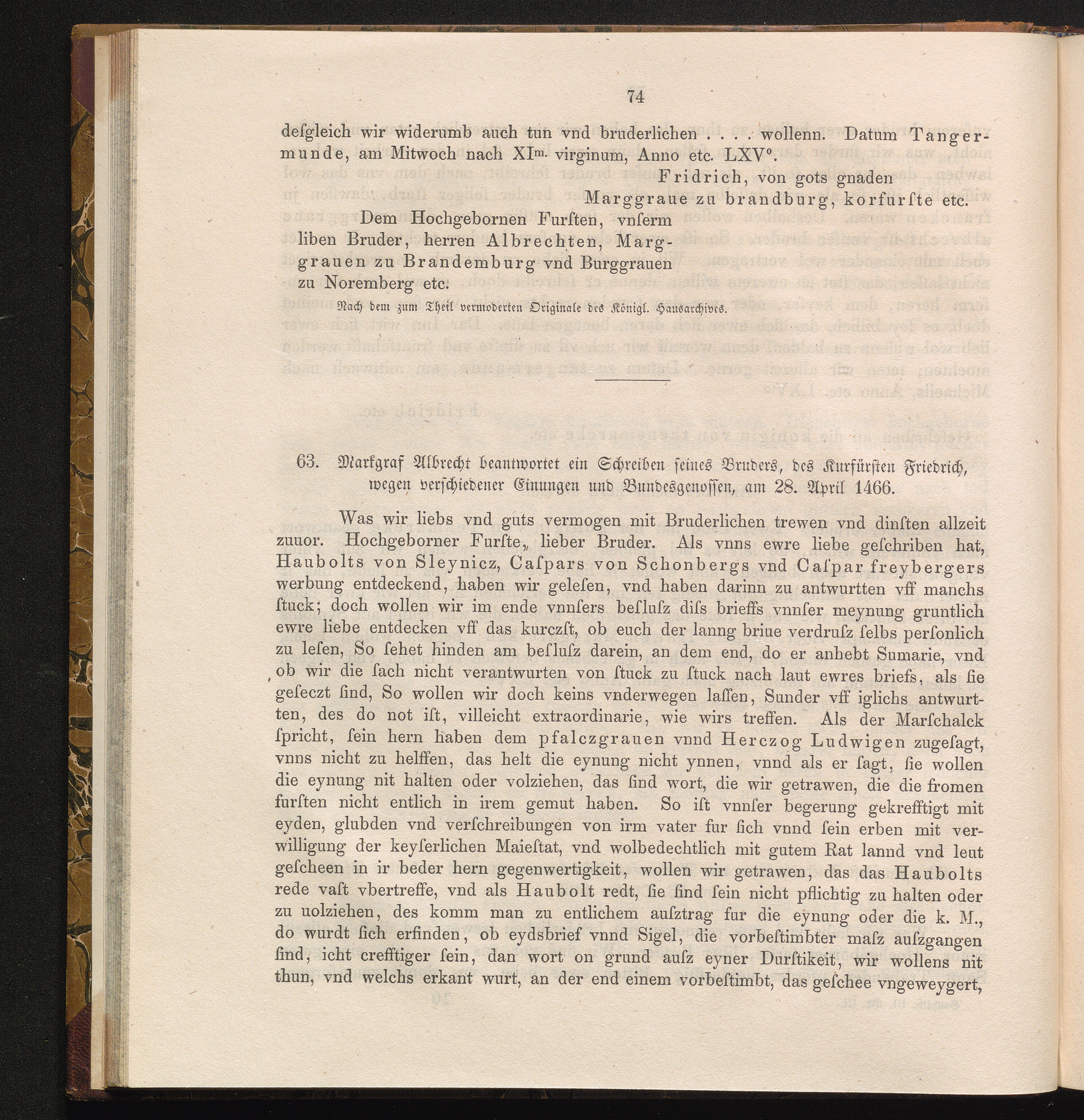 63. Markgraf Albrecht beantwortet ein Schreiben seines Bruders, des Kurfürsten Friedrich,[...]