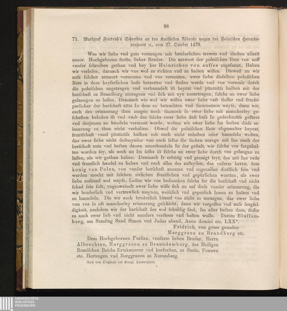 71. Markgraf Friedrich's Schreiben an den Kurfürsten Albrecht wegen der Polnischen[...]
