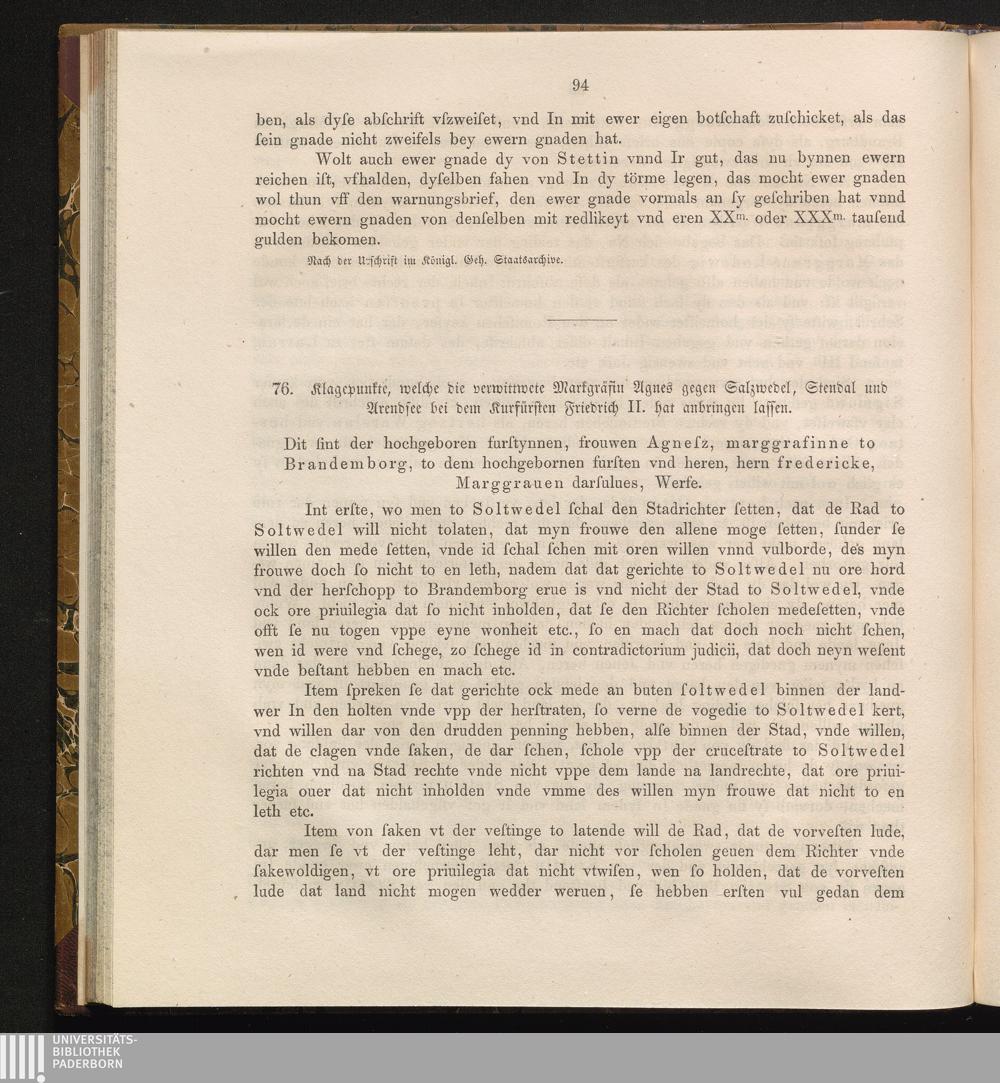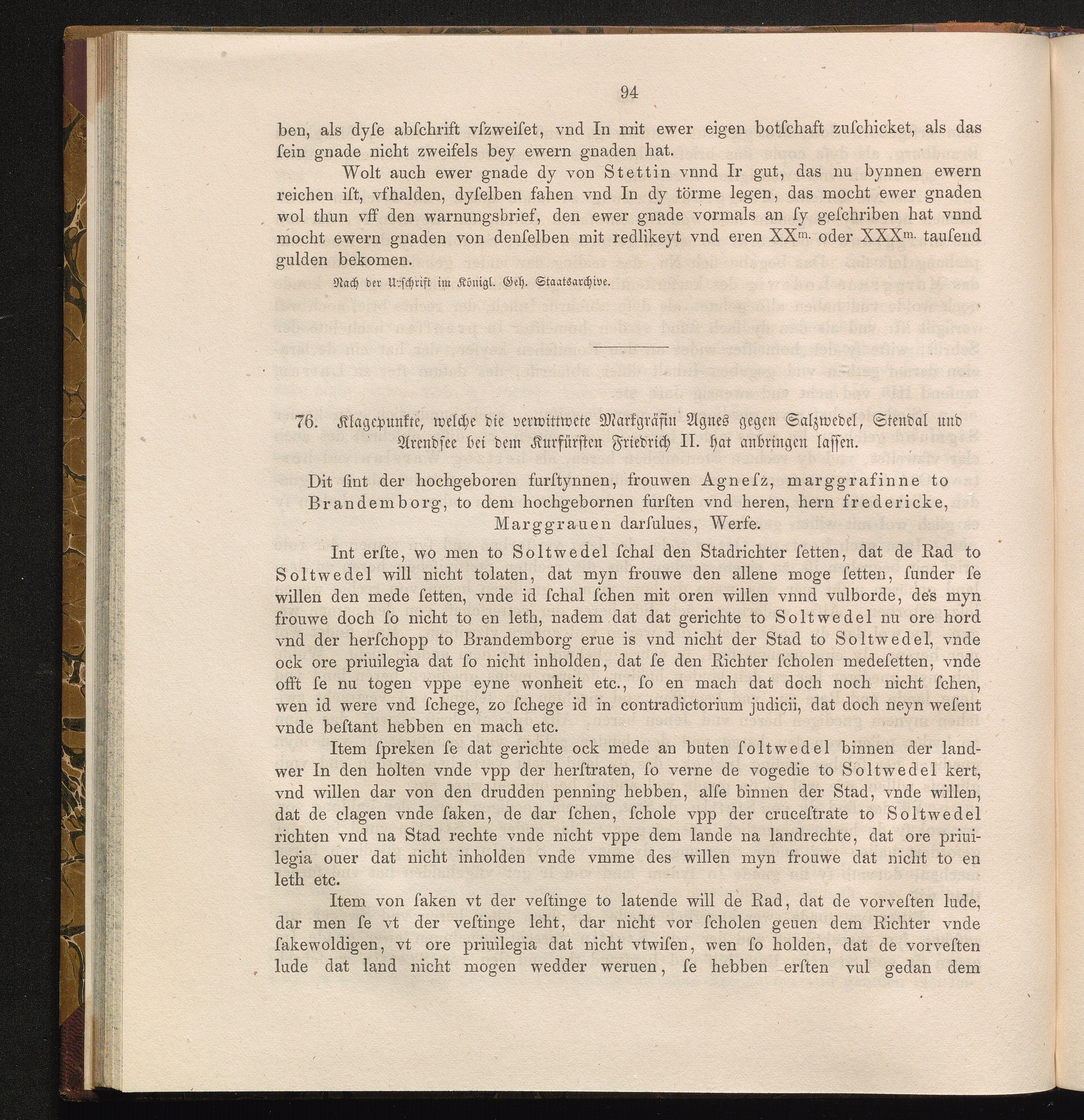 76. Klagepunkte, welche die verwittwete Markgräfin Agnes gegen Salzwedel, Stendal[...]