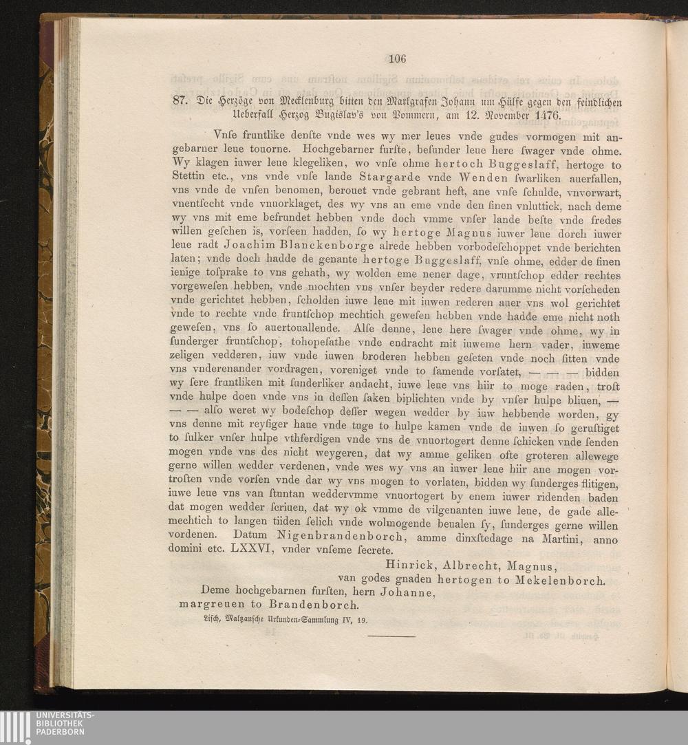87. Die Herzöge von Mecklenburg bitten den Markgrafen Johann um Hülfe gegen den feindlichen[...]