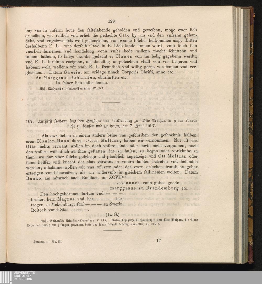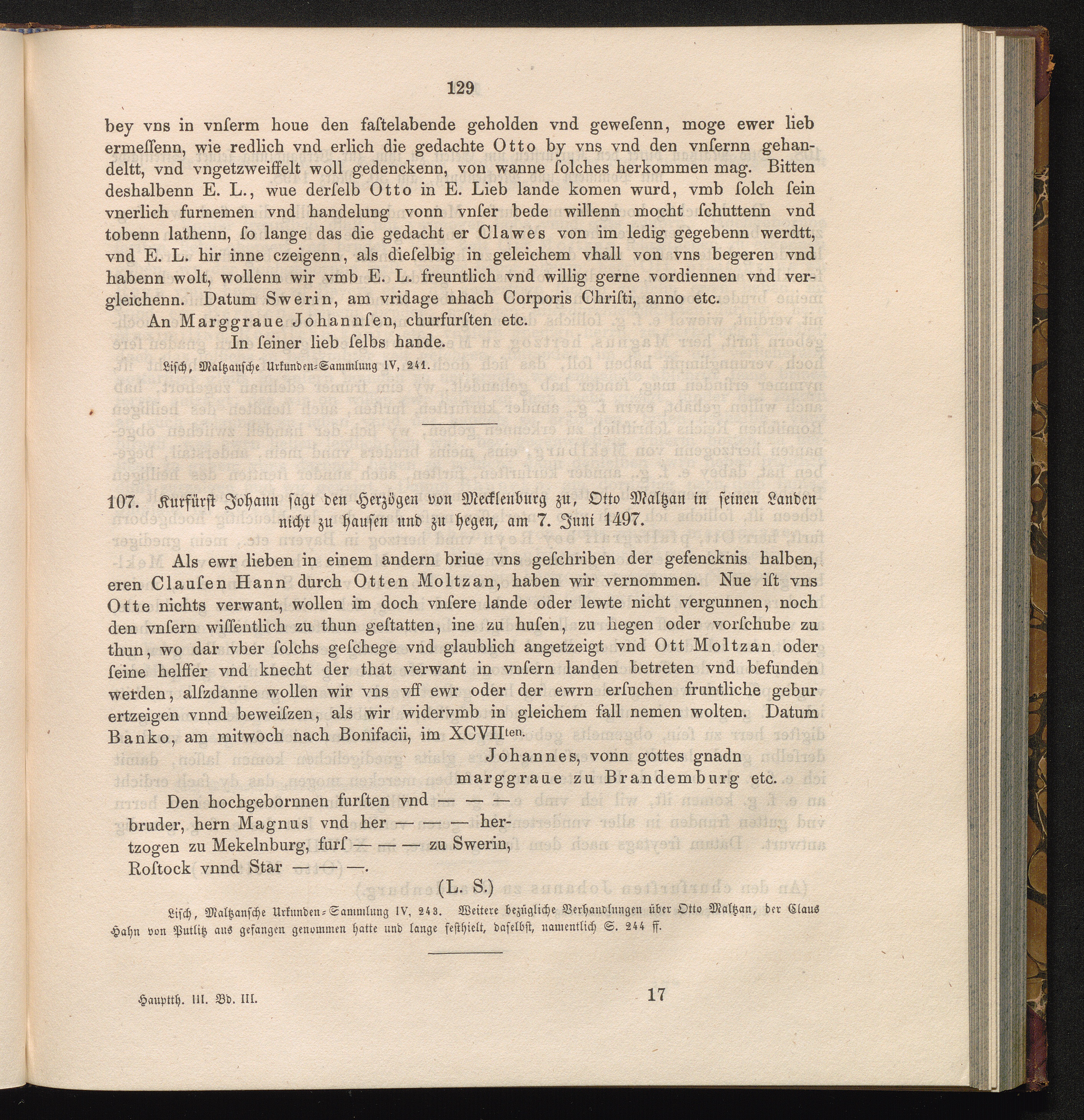 107. Kurfürst Johann sagt den Herzögen von Mecklenburg zu, Otto von Maltzan in seinen[...]