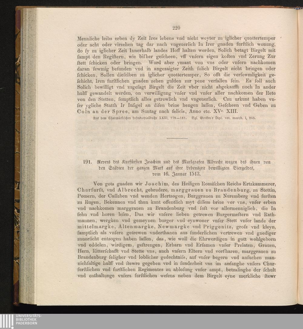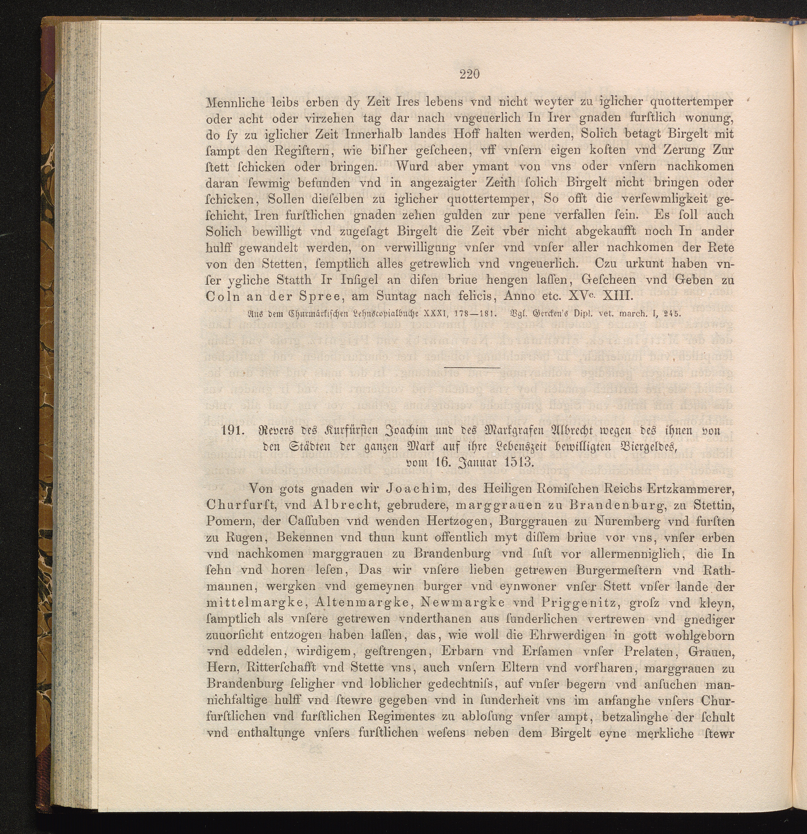191. Revers des Kurfürsten Joachim und des Markgrafen Albrecht wegen des ihnen von[...]