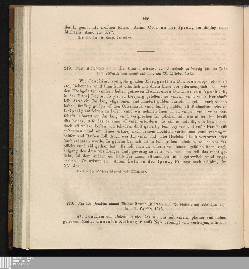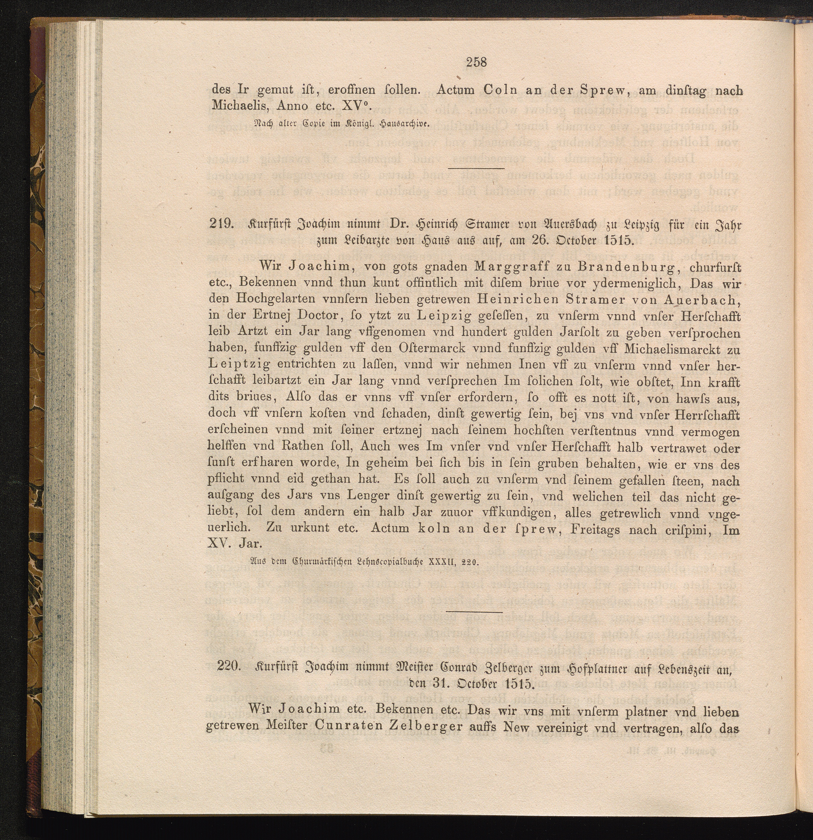 219. Kurfürst Joachim nimmt Dr. Heinrich Stramer von Auersbach zu Leipzig für ein[...]