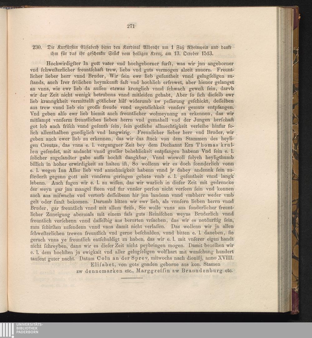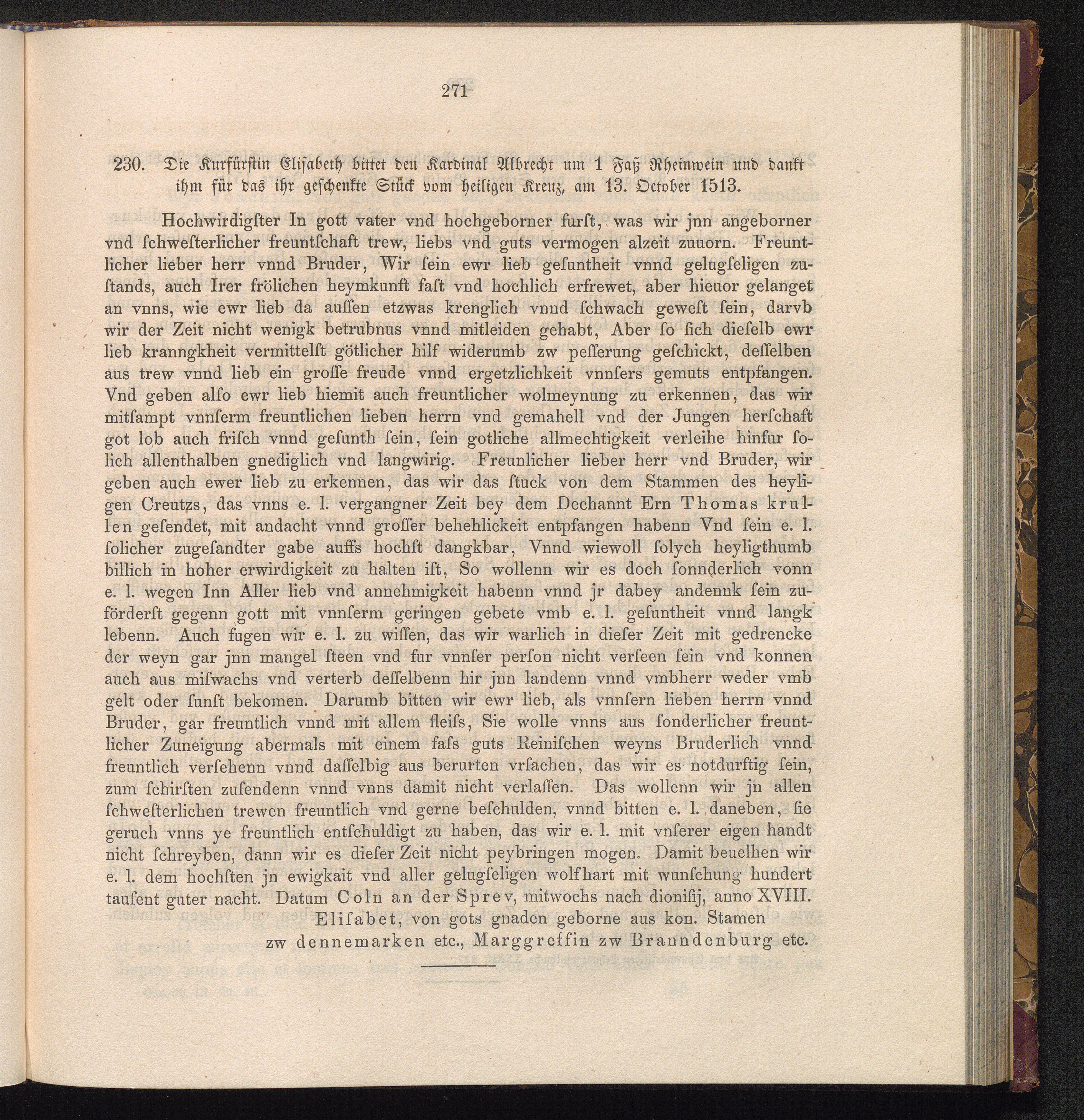 230. Die Kurfürstin Elisabeth bittet den Kardinal Albrecht um 1 Faß Rheinwein und[...]
