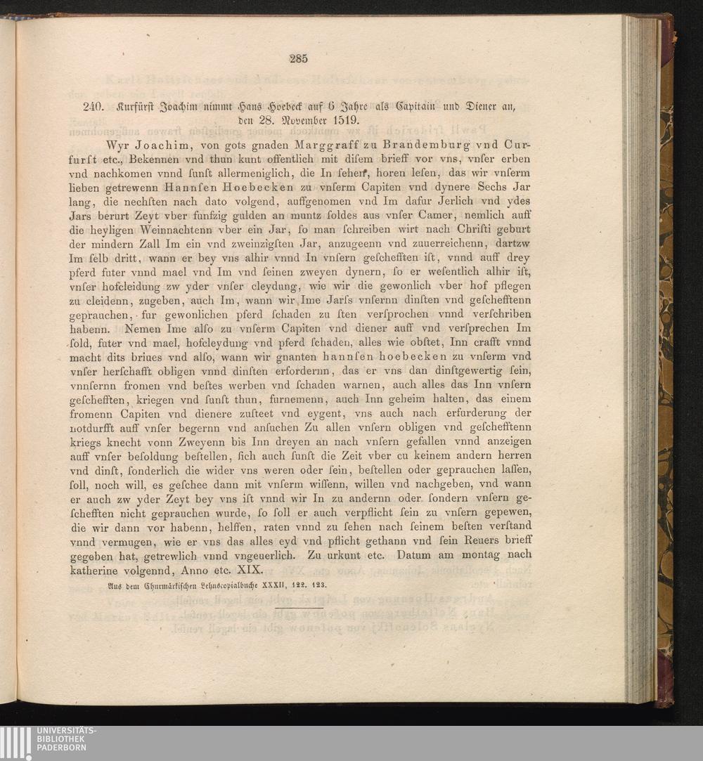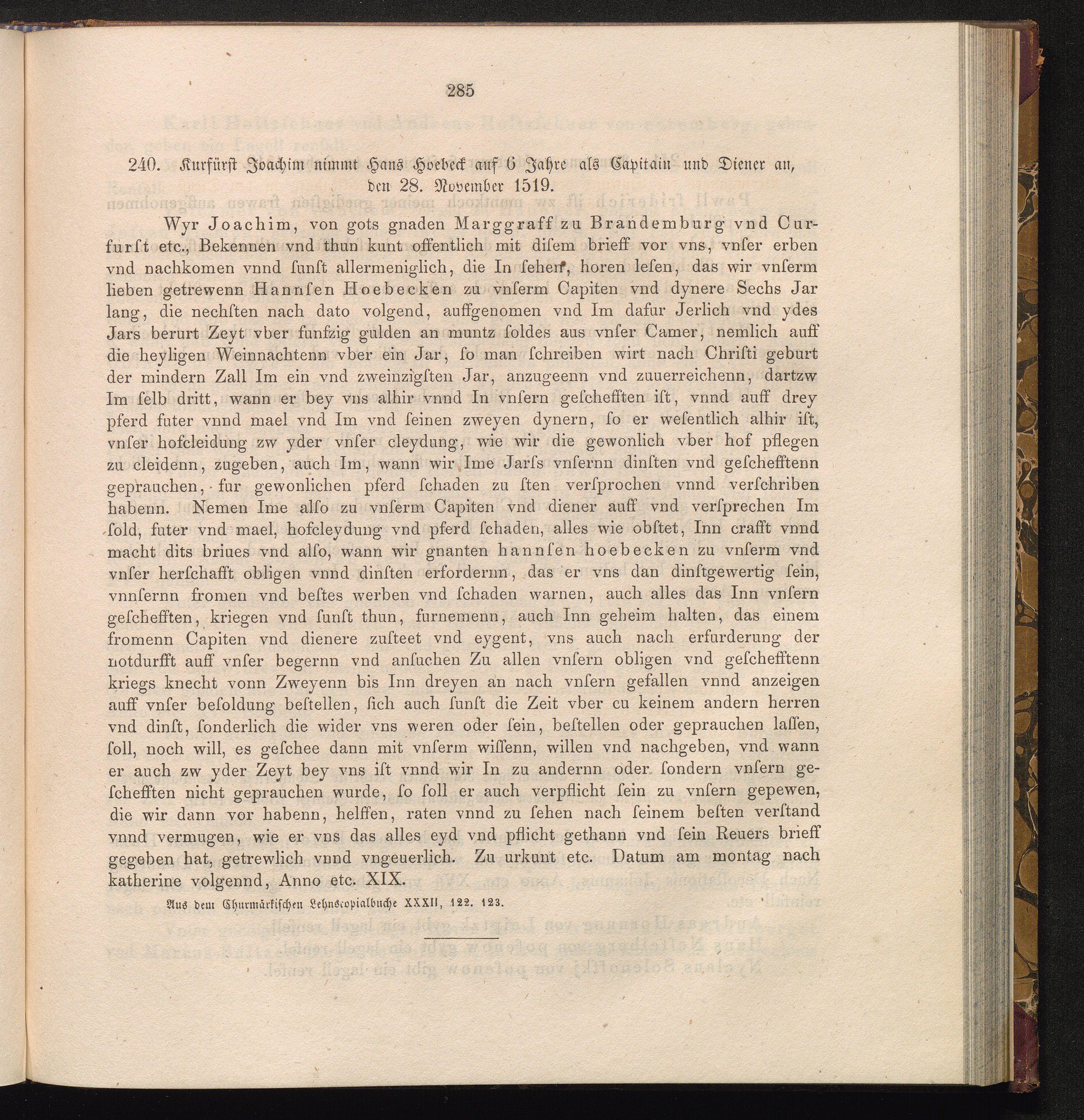 240. Kurfürst Joachim nimmt Hans Hoebeck auf 6 Jahre als Capitain und Diener an,[...]