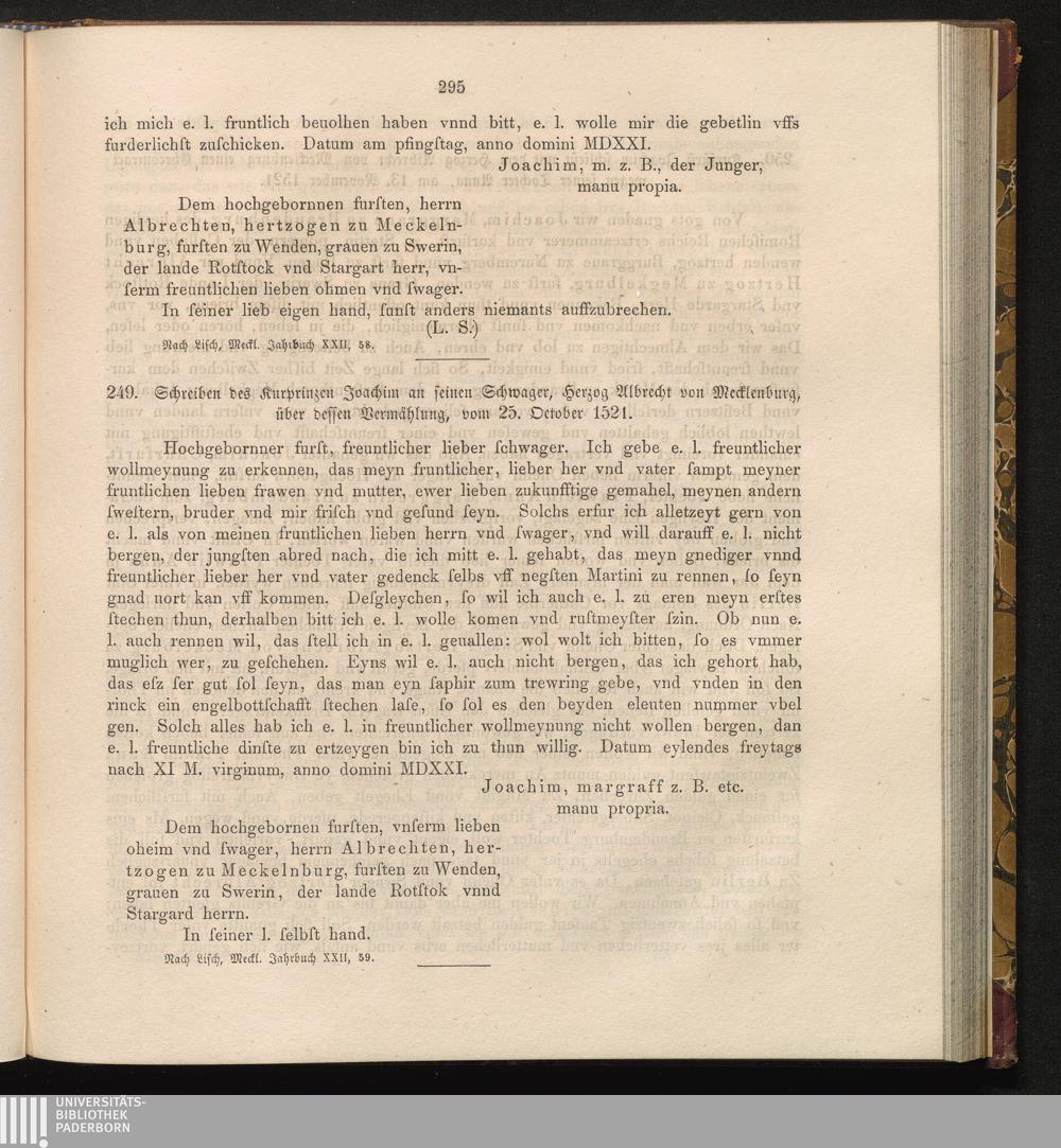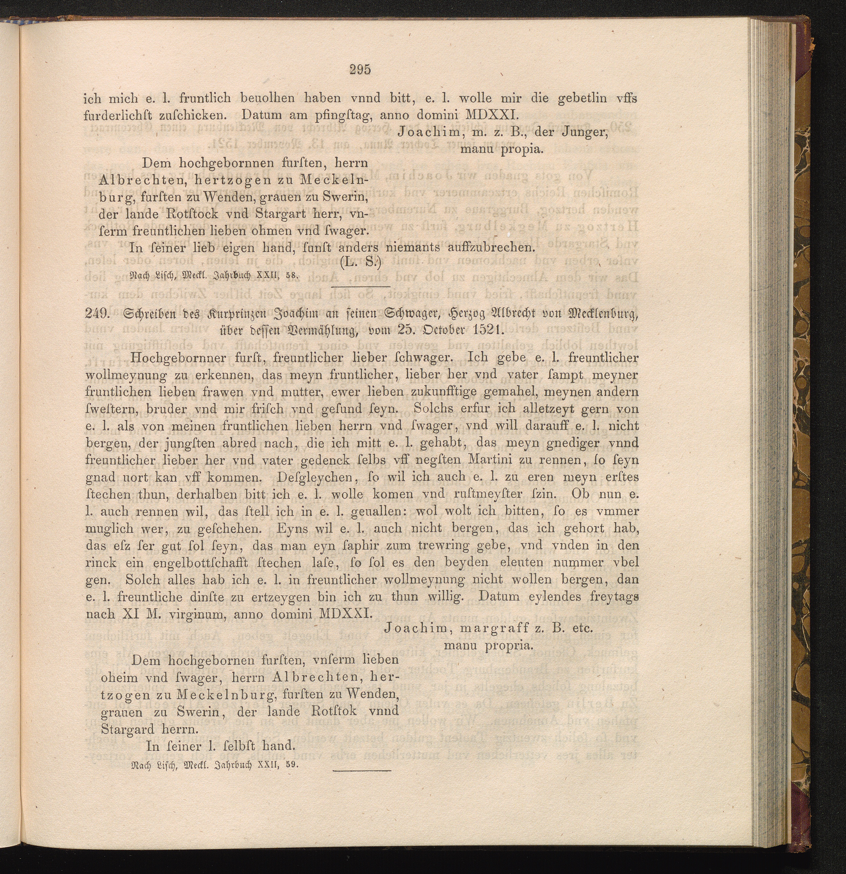 249. Schreiben des Kurprinzen Joachim an seinen Schwager, Herzog Albrecht von Mecklenburg,[...]