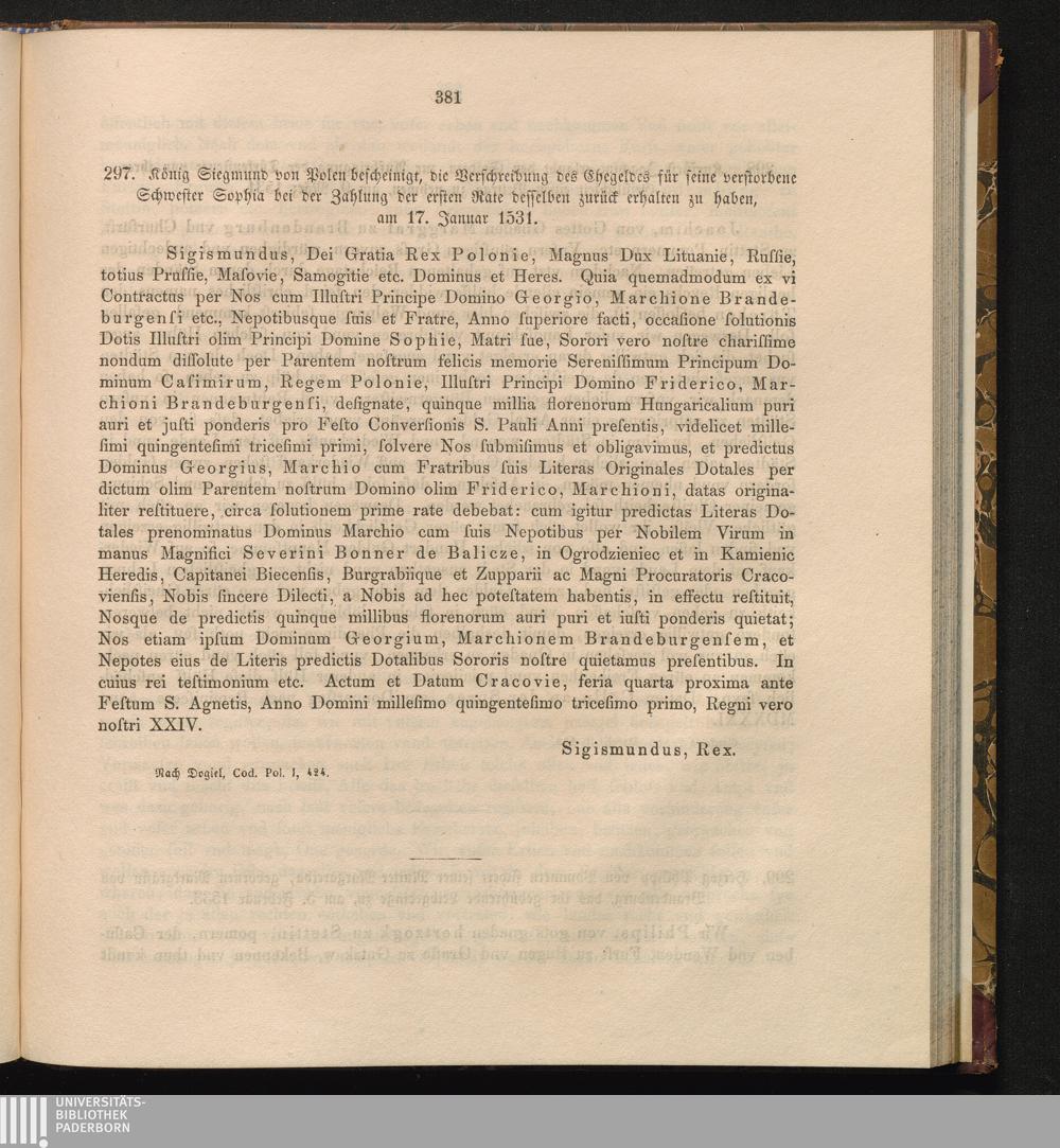 297. König Siegmund von Polen bescheinigt, die Verschreibung des Ehegeldes für seine[...]