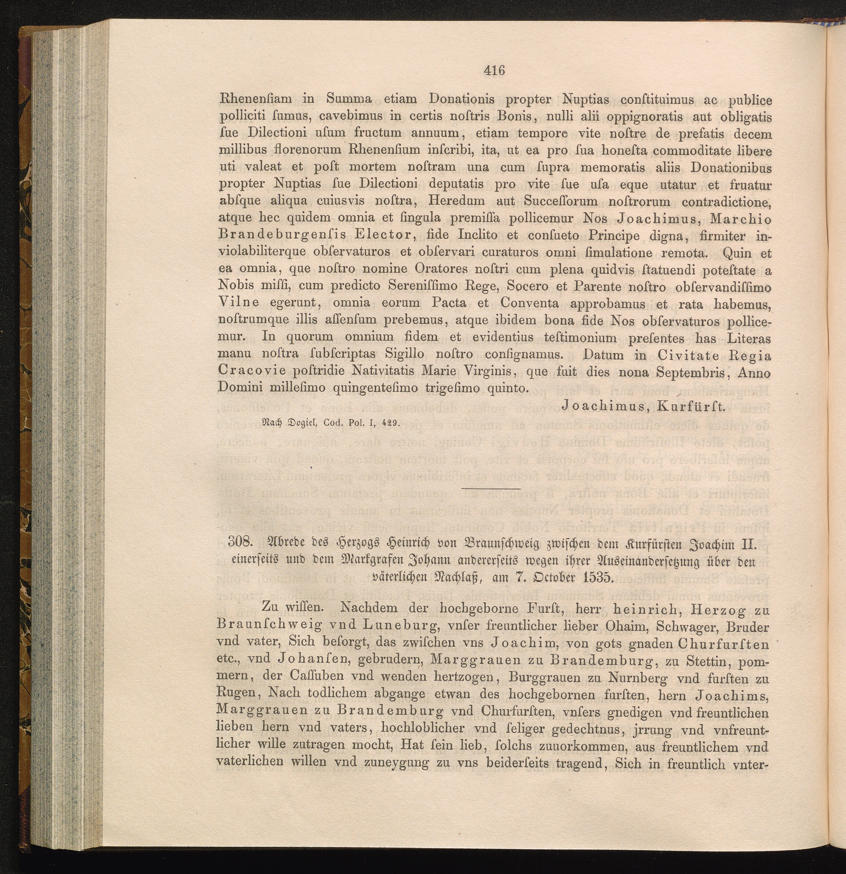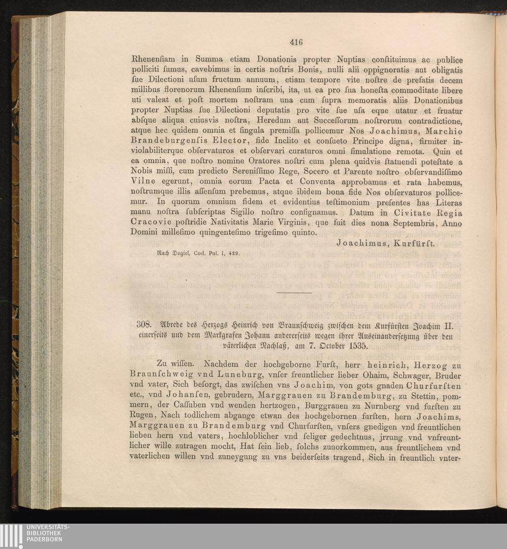 308. Abrede des Herzogs Heinrich von Braunschweig zwischen dem Kurfürsten Joachim[...]