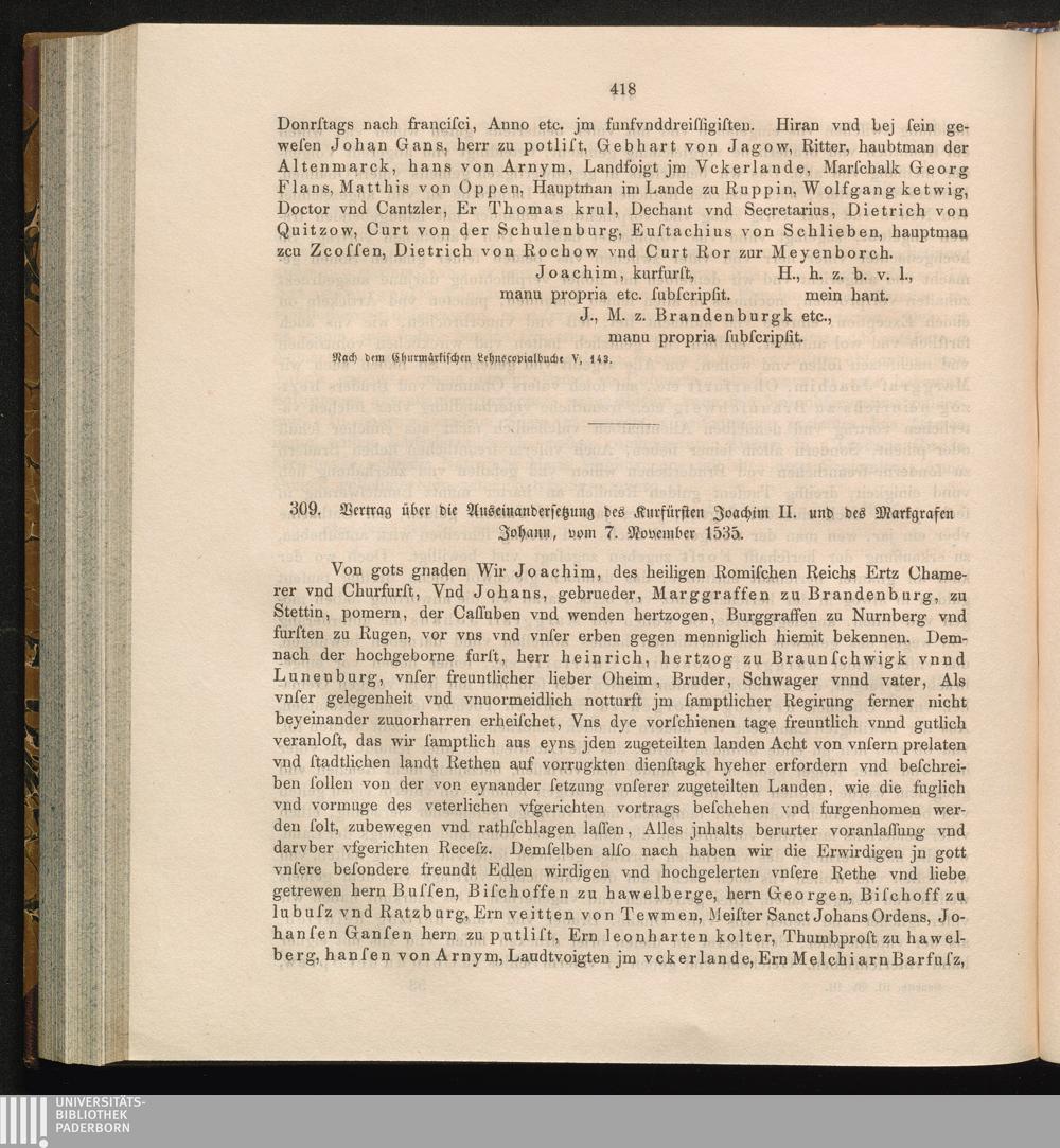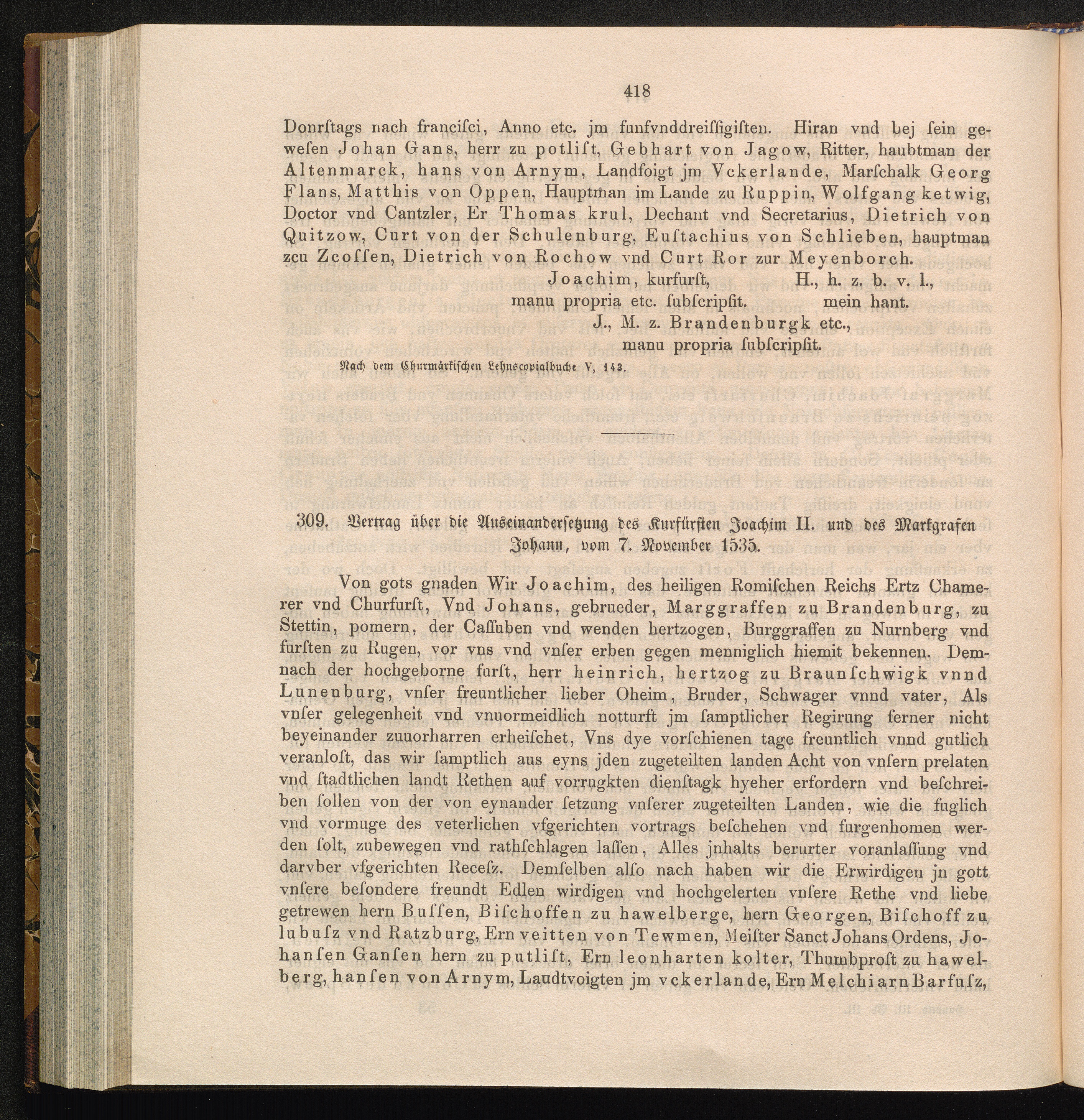 309. Vertrag über die Auseinandersetzung des Kurfürsten Joachim II. und des Markgrafen[...]