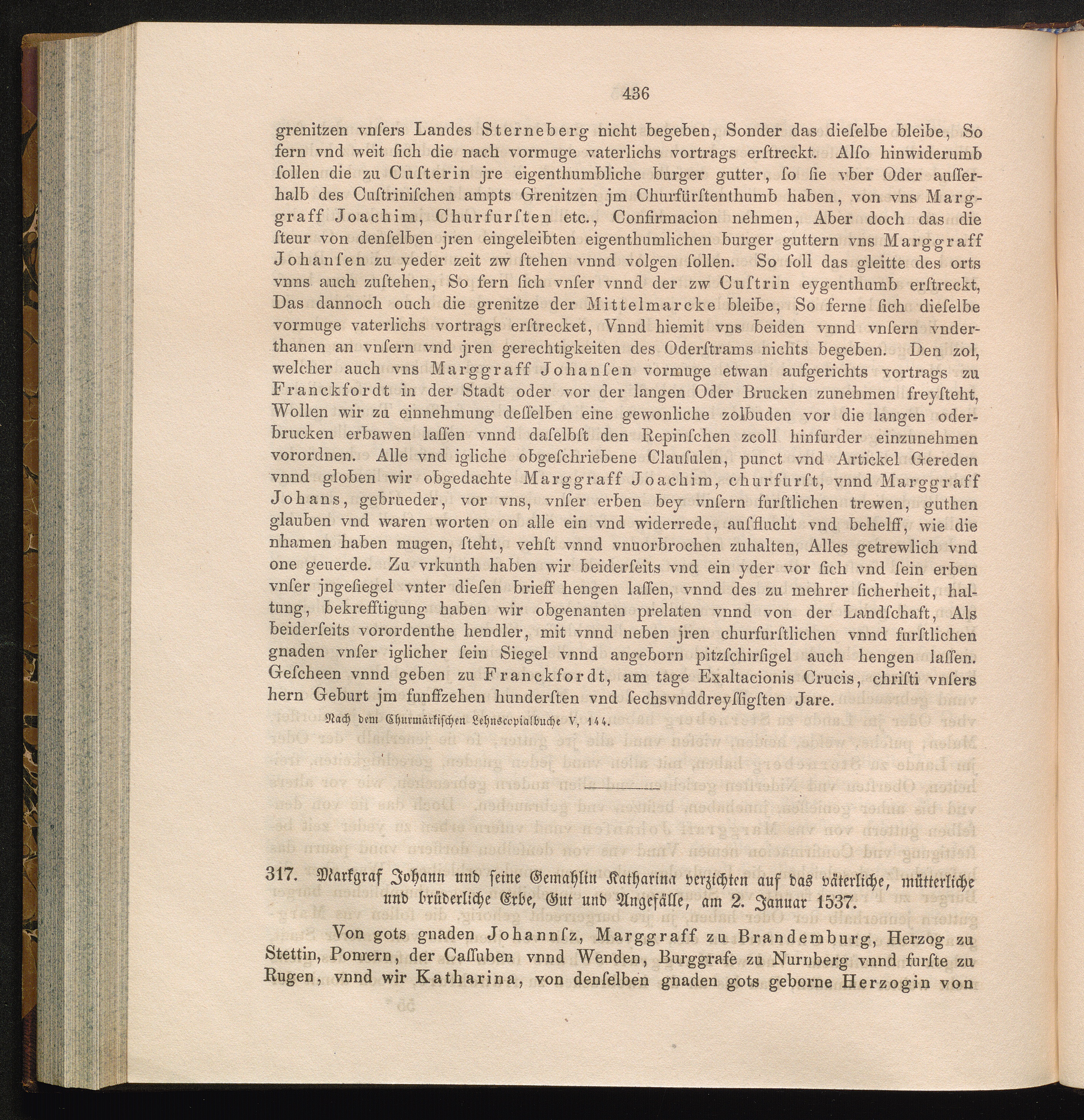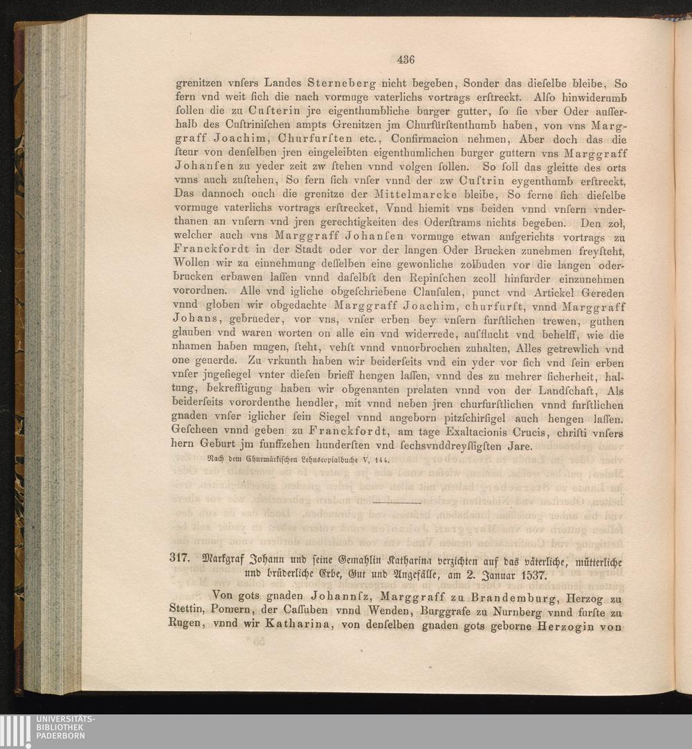 317. Markgraf Johann und seine Gemahlin Katharina verzichten auf das väterliche,[...]