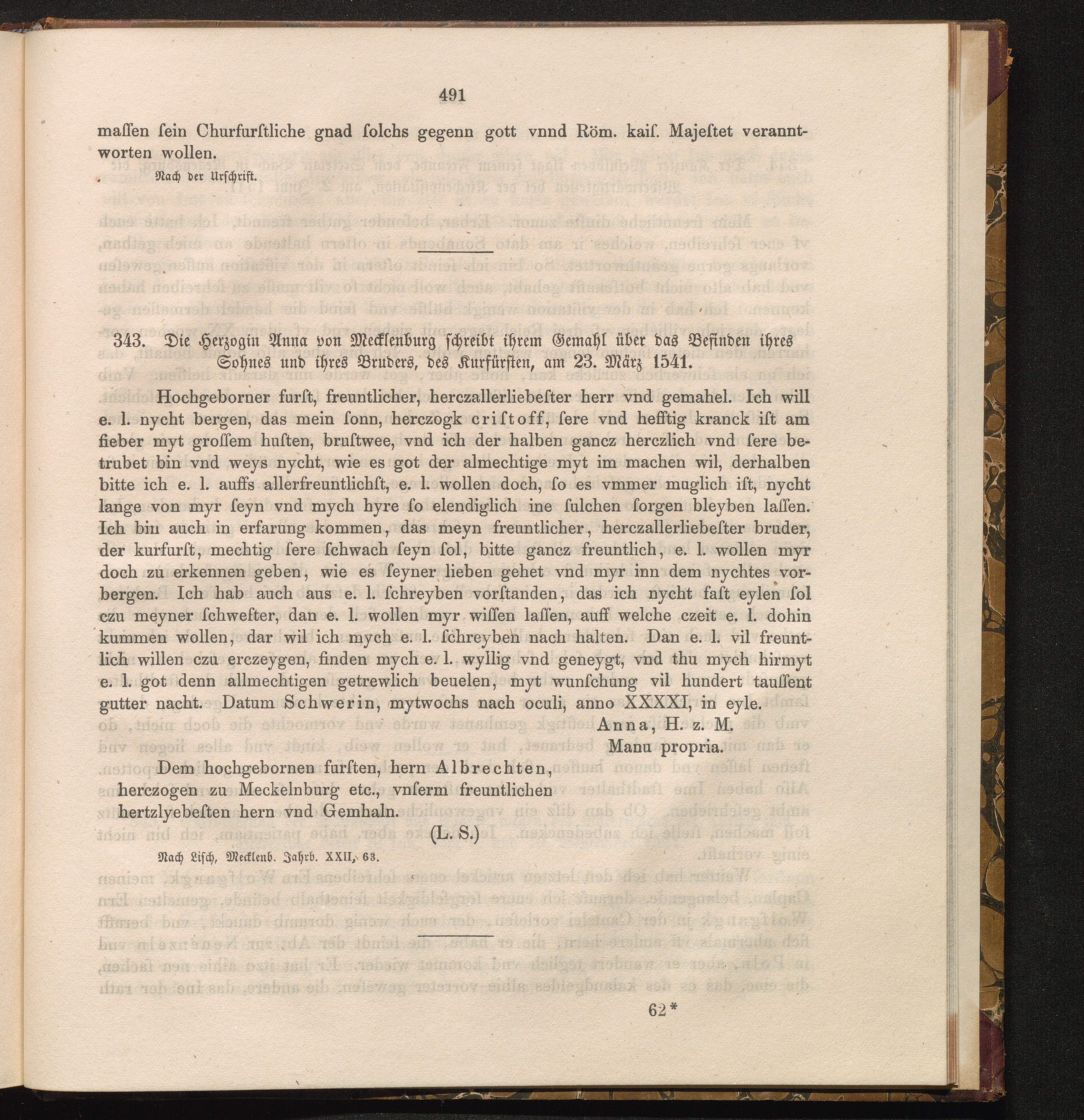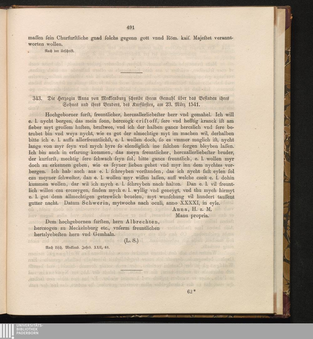 343. Die Herzogin Anna von Mecklenburg schreibt ihrem Gemahl über das Befinden ihres[...]