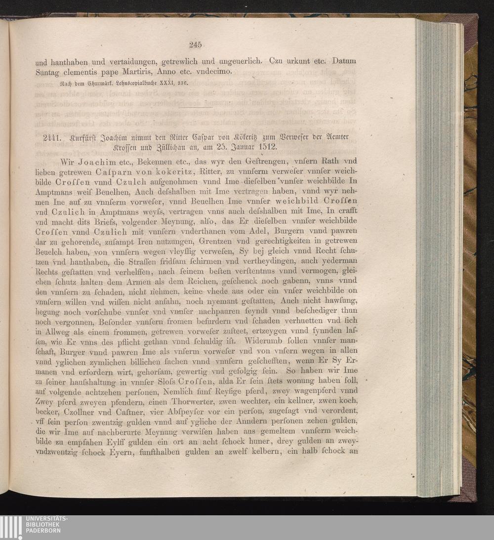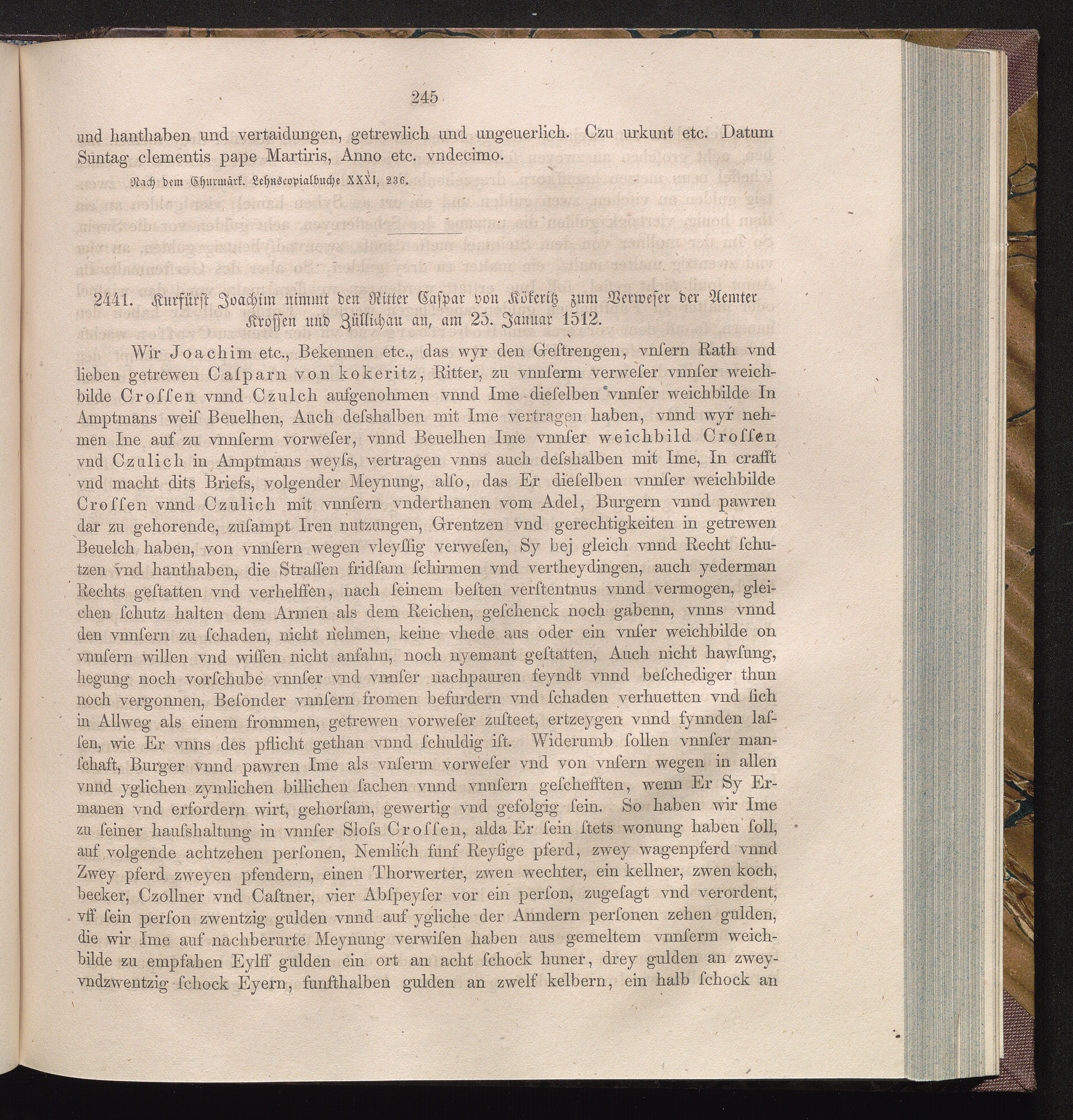 2441. Kurfürst Joachim nimmt den Ritter Caspar von Kökeritz zum Verweser der Aemter[...]
