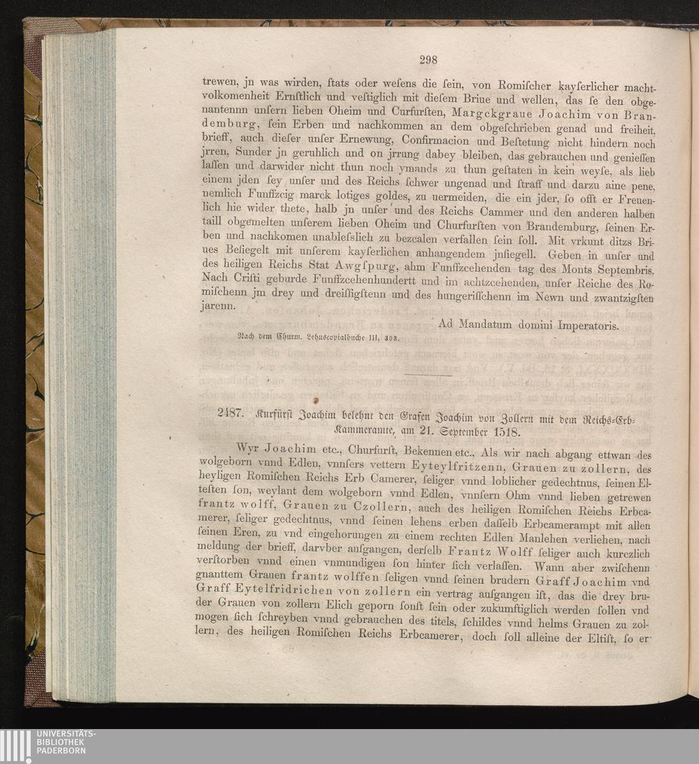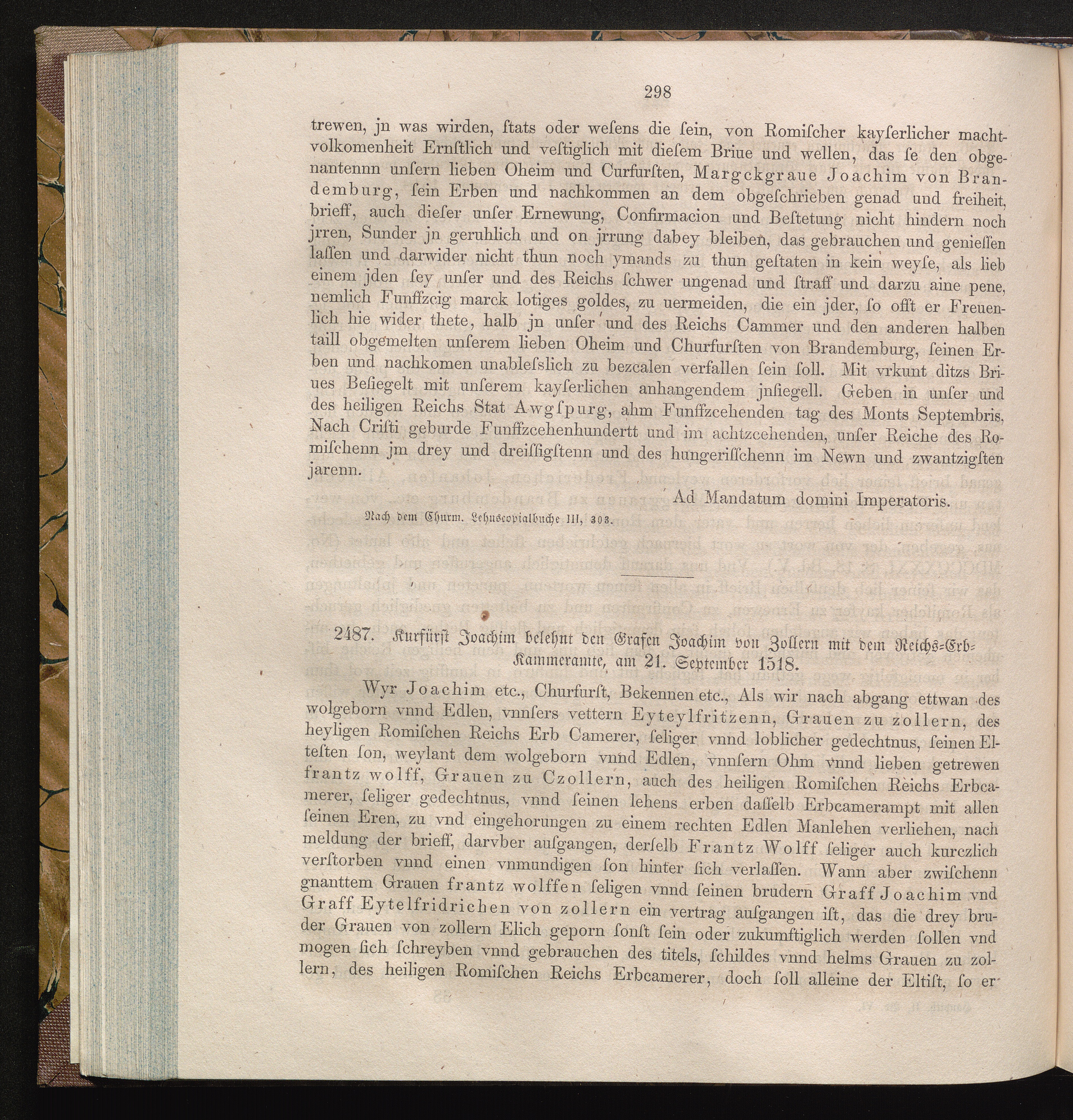 2487. Kurfürst Joacahim belehnt den Grafen Joachim von Zollern mit dem Reichs-Erb-Kammeramte,[...]