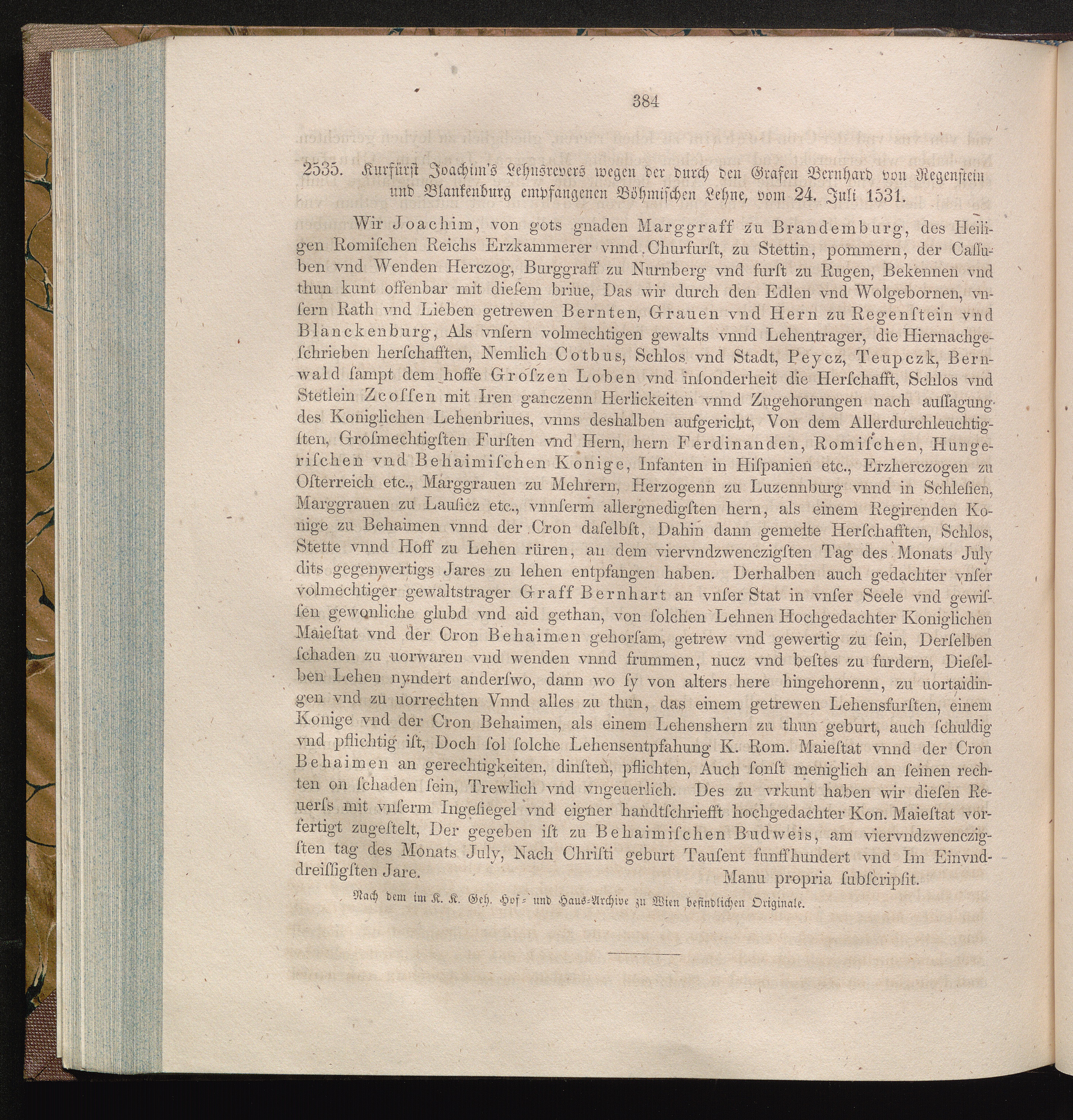 2535. Kurfürst Joachim`s Lehnsrevers wegen der durch den Grafen Bernhard von Regenstein[...]