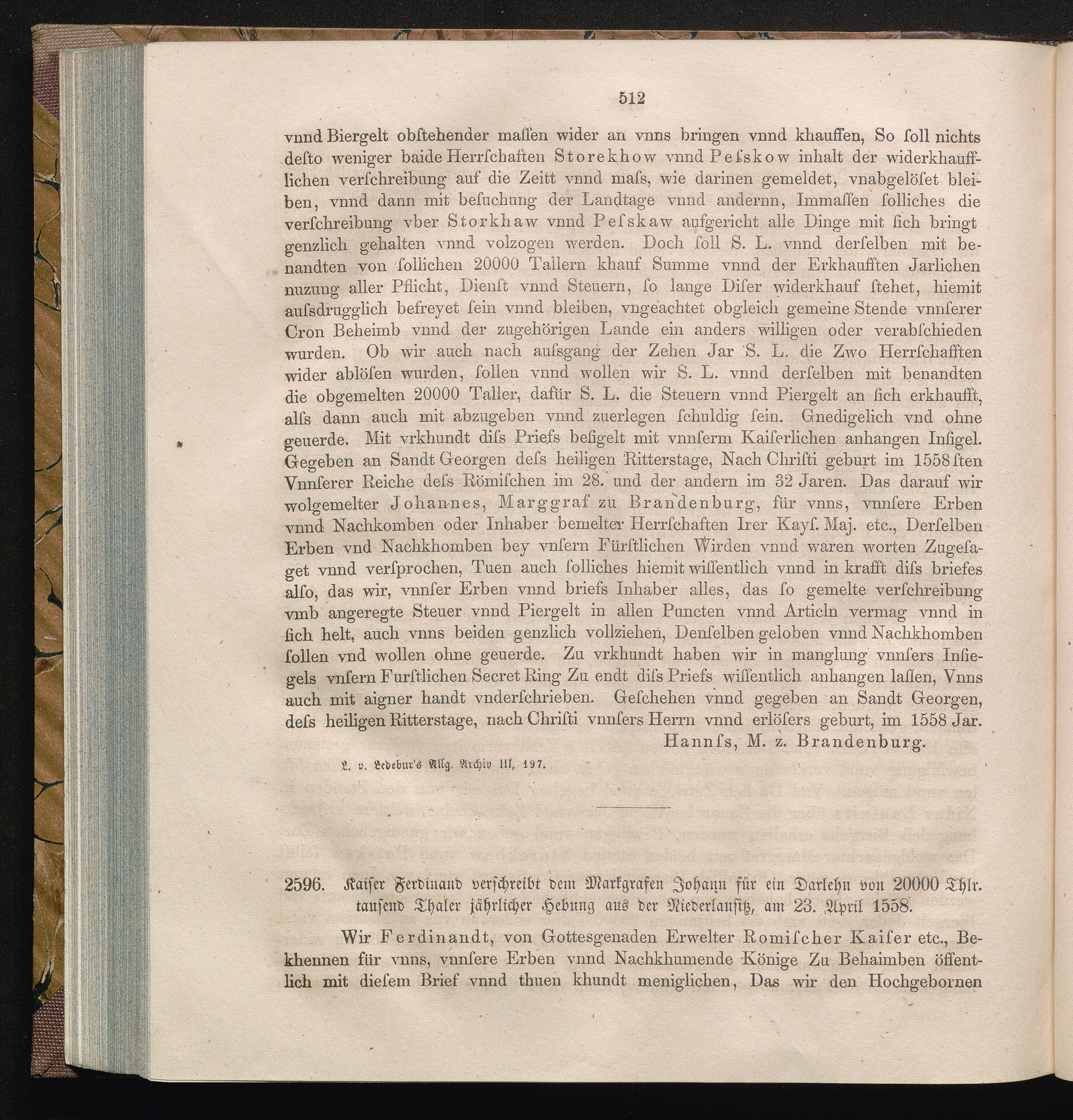 2596. Kaiser Ferdinand verschreibt dem Markgrafen Johann für ein Darlehn von 20000[...]