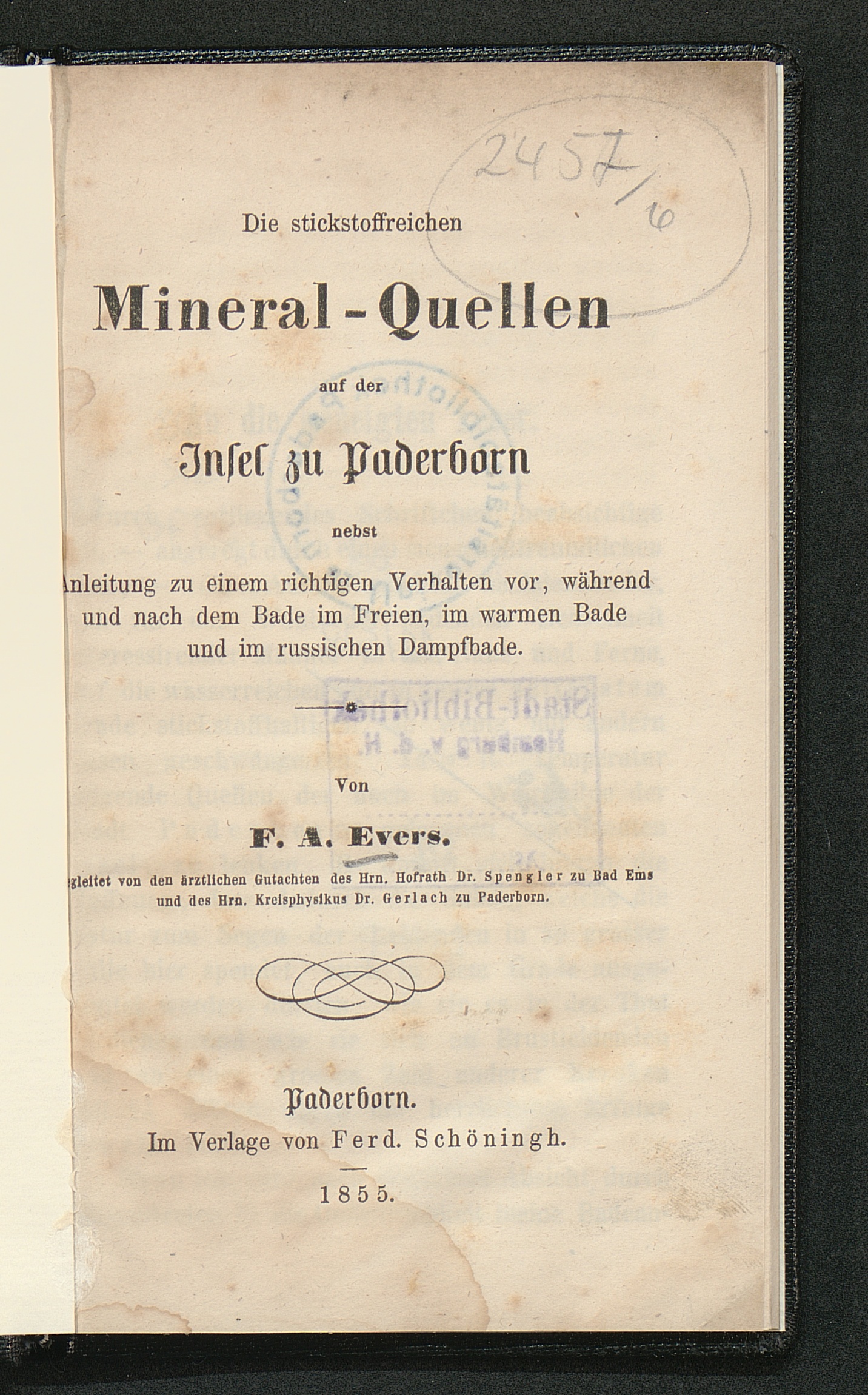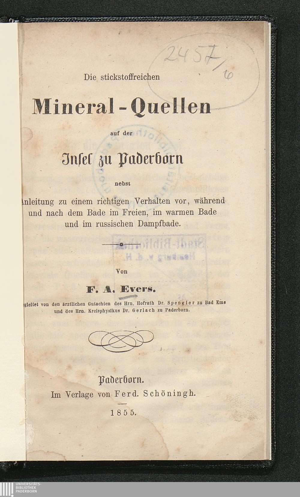 Die stickstoffreichen Mineralquellen auf der Insel zu Paderborn : nebst Anleitung zu einem richtigen Verhalten vor, während und nach dem Bade im Freien, im warmen Bade und im russischen Dampfbade / von F. A. Evers