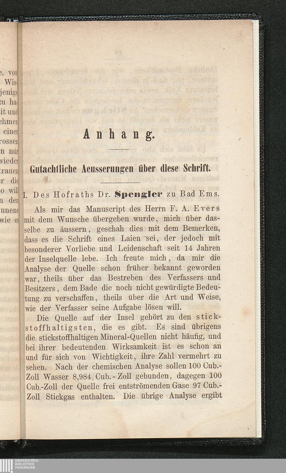 Die stickstoffreichen Mineralquellen auf der Insel zu Paderborn : nebst Anleitung zu einem richtigen Verhalten vor, während und nach dem Bade im Freien, im warmen Bade und im russischen Dampfbade / von F. A. Evers