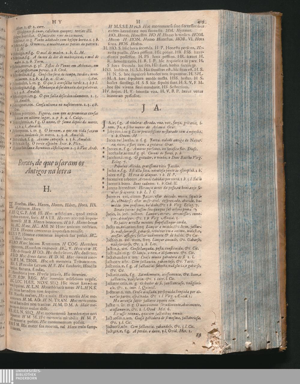 Prosodia In Vocabularium Bilingue, Latinum, Et Lusitanum, Digesta, In Qua Dictionum Significatio, Et Syllabarum Quantitas Expenditur : Opus Omnino Necessarium Professoribus Sacrarum, Et Humaniorum Literarum, Medicis, Juristis, & omnibus cujuscunque facultatis Studiosis, tum propter innumeras dictiones, quas à Sacris, & profanis Auctoribus decerptas exponit; tum propter recondita carmina omnium veterum Poetarum, & Recentiorum clari nominis, quos omnes Auctor ad expendendas syllabas perlegit / Auctore Doctore P. Benedicto Pereyra Soc. Jesu, Portugalensi, Borbano, in Eborensi Academiâ Primario olim Rhetorices Professore, & tandem in eâdem Academiâ S. Theologiæ Professore Primario