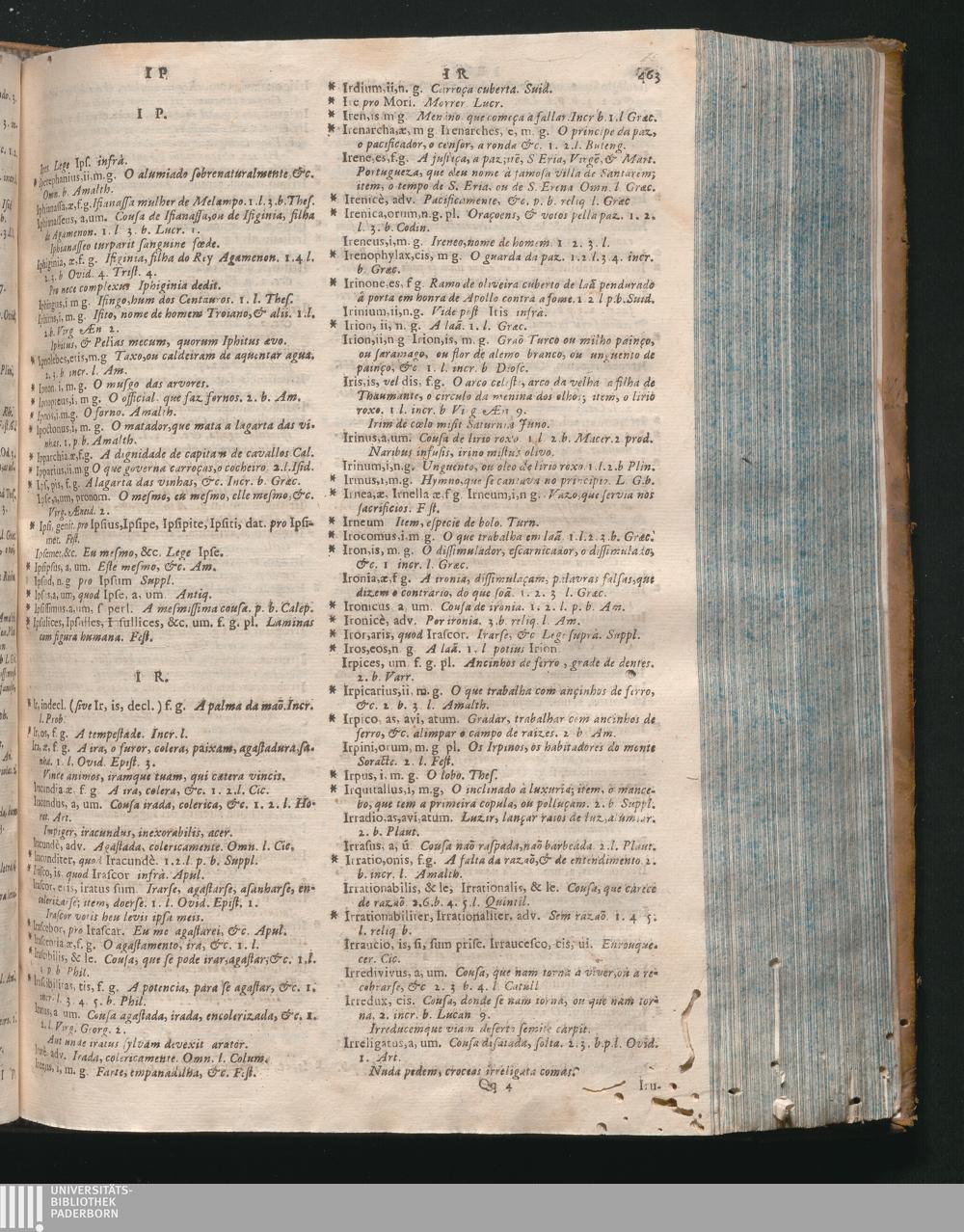 Prosodia In Vocabularium Bilingue, Latinum, Et Lusitanum, Digesta, In Qua Dictionum Significatio, Et Syllabarum Quantitas Expenditur : Opus Omnino Necessarium Professoribus Sacrarum, Et Humaniorum Literarum, Medicis, Juristis, & omnibus cujuscunque facultatis Studiosis, tum propter innumeras dictiones, quas à Sacris, & profanis Auctoribus decerptas exponit; tum propter recondita carmina omnium veterum Poetarum, & Recentiorum clari nominis, quos omnes Auctor ad expendendas syllabas perlegit / Auctore Doctore P. Benedicto Pereyra Soc. Jesu, Portugalensi, Borbano, in Eborensi Academiâ Primario olim Rhetorices Professore, & tandem in eâdem Academiâ S. Theologiæ Professore Primario