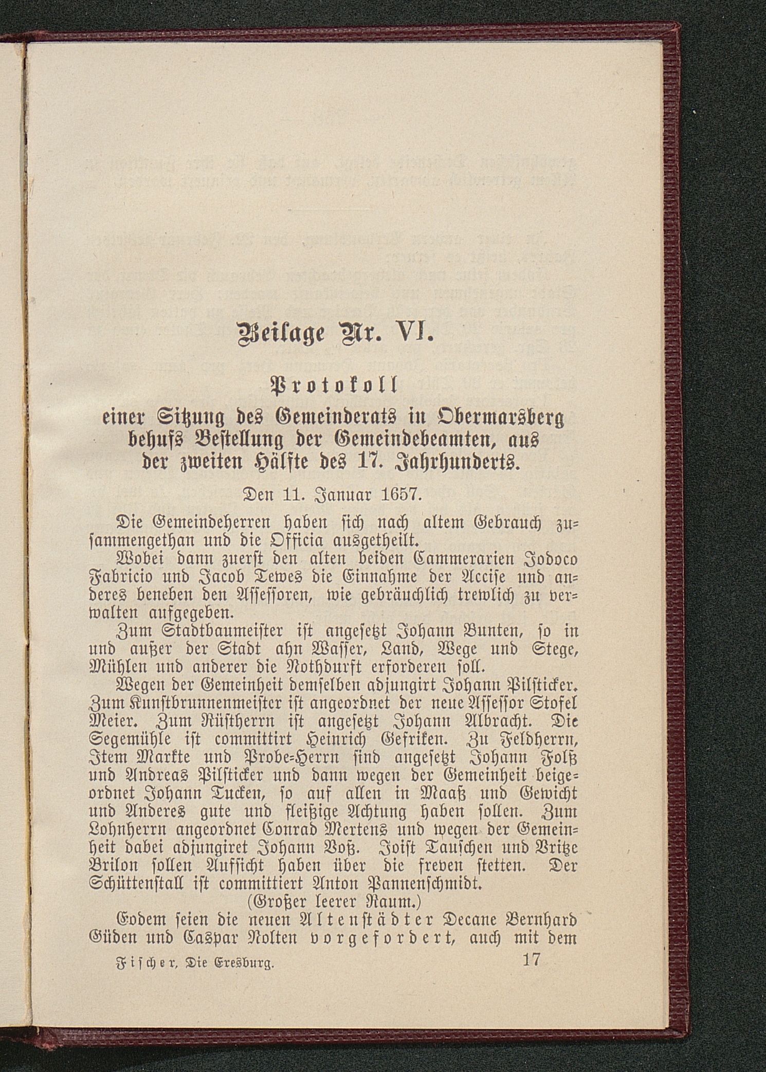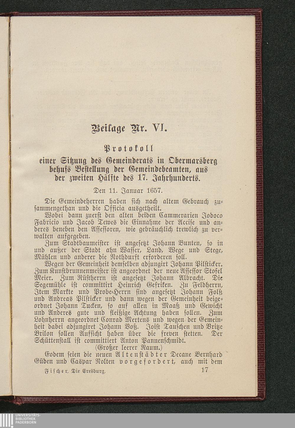 Beilage Nr. VI. Protokoll einer Sitzung des Gemeinderats in Obermarsberg behufs Bestellung der Gemeindebeamten, aus der zweiten Hälfte des 17. Jahrhunderts.