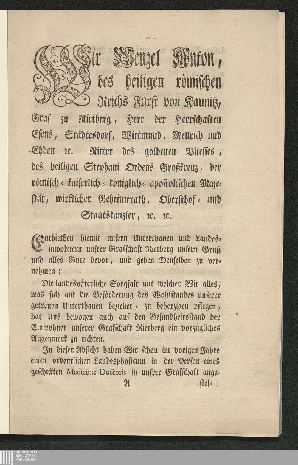 Wir Wenzel Anton des heiligen rœmischen Reichs Fuerst von Kaunitz, Graf zu Rietberg, Herr der Herrschaften Esens, Stædtesdorf, Wittmund, Mellrich und Ehden [et]c. Ritter des goldenen Vliesses, des heiligen Stephani Ordens Großkreuz, der rœmisch=kaiserlich=kœniglich=apostolischen Majestæt, wirklicher Geheimerath, Obersthof= und Staatskanzler, ... Entbiethen hiemit unsern Unterthanen ... unseren Gruß ... : Die landesvæterliche Sorgfalt mit welcher Wir alles, was sich auf die Befœrderung des Wohlstandes unserer getreuen Unterthanen beziehet, zu beherzigen pflegen, hat Uns bewogen auch auf den Gesundheitsstand der Einwohner unserer Grafschaft Rietberg ein vorzuegliches Augenmerk zu richten ... ; Gegeben zu Wien den 18ten Jenner im Jahr Christi 1782